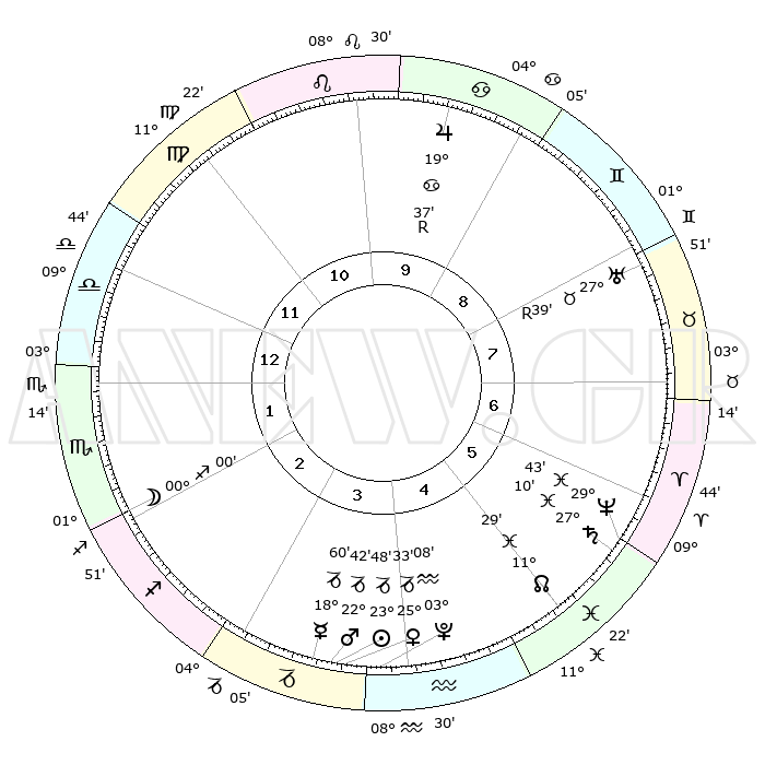 | | ΘΕΣΕΙΣ ΠΛΑΝΗΤΩΝ ΑΣΤΡΟΛΟΓΙΚΟΥ ΧΑΡΤΗ ΤΗΣ ΣΤΙΓΜΗΣ ΑΥΤΗΣ | | | | Πλανήτης | Ζώδιο | Μοίρες | Δεκαήμ. | Σε οίκο | Απόκλιση | | Ακμές των οίκων | | Ηλιος | Αιγόκερως | 23°44' | Τρίτο | 4 | 21 S 21 | | 1ος | 13°45' | Ζυγός | | Σελήνη | Σκορπιός | 29°13' | Τρίτο | 2 | 24 S 53 | | 2ος | 11°14' | Σκορπιός | | Ερμής | Αιγόκερως | 18°53' | Δεύτερο | 4 | 23 S 48 | | 3ος | 12°13' | Τοξότης | | Αφροδίτη | Αιγόκερως | 25°28' | Τρίτο | 4 | 21 S 58 | | 4ος | 15°32' | Αιγόκερως | | Αρης | Αιγόκερως | 22°39' | Τρίτο | 4 | 22 S 29 | | 5ος | 18°28' | Υδροχόος | | Δίας | Καρκίνος | 19°37'R | Δεύτερο | 10 | 22 N 16 | | 6ος | 18°18' | Ιχθείς | | Κρόνος | Ιχθείς | 27°10' | Τρίτο | 6 | 03 S 10 | | 7ος | 13°45' | Κριός | | Ουρανός | Ταύρος | 27°39'R | Τρίτο | 8 | 19 N 26 | | 8ος | 11°14' | Ταύρος | | Ποσειδώνας | Ιχθείς | 29°43' | Τρίτο | 6 | 01 S 20 | | 9ος | 12°13' | Δίδυμοι | | Πλούτωνας | Υδροχόος | 03°07' | Πρώτο | 4 | 23 S 08 | | 10ος | 15°32' | Καρκίνος | | Β. Δεσμός | Ιχθείς | 11°29' | Δεύτερο | 5 | 07 S 15 | | 11ος | 18°28' | Λέων | | Ωροσκόπος | Ζυγός | 13°45' | Δεύτερο | | | 12ος | 18°18' | Παρθένος | | Μεσουράνημα | Καρκίνος | 15°32' | Δεύτερο | | | |