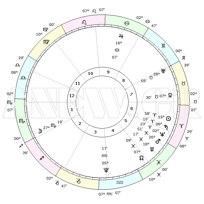 | | ΘΕΣΕΙΣ ΠΛΑΝΗΤΩΝ ΑΣΤΡΟΛΟΓΙΚΟΥ ΧΑΡΤΗ ΤΗΣ ΣΤΙΓΜΗΣ ΑΥΤΗΣ | | | | Πλανήτης | Ζώδιο | Μοίρες | Δεκαήμ. | Σε οίκο | Απόκλιση | | Ακμές των οίκων | | Ηλιος | Κριός | 15°54' | Δεύτερο | 7 | 06 N 15 | | 1ος | 13°01' | Ζυγός | | Σελήνη | Σκορπιός | 26°32' | Τρίτο | 2 | 24 S 17 | | 2ος | 10°28' | Σκορπιός | | Ερμής | Ιχθείς | 18°13' | Δεύτερο | 6 | 06 S 26 | | 3ος | 11°25' | Τοξότης | | Αφροδίτη | Ταύρος | 07°25' | Πρώτο | 7 | 13 N 45 | | 4ος | 14°42' | Αιγόκερως | | Αρης | Ιχθείς | 26°48' | Τρίτο | 6 | 02 S 13 | | 5ος | 17°38' | Υδροχόος | | Δίας | Καρκίνος | 16°07' | Δεύτερο | 10 | 22 N 50 | | 6ος | 17°30' | Ιχθείς | | Κρόνος | Κριός | 06°15' | Πρώτο | 6 | 00 N 31 | | 7ος | 13°01' | Κριός | | Ουρανός | Ταύρος | 28°58' | Τρίτο | 8 | 19 N 45 | | 8ος | 10°28' | Ταύρος | | Ποσειδώνας | Κριός | 02°23' | Πρώτο | 6 | 00 S 15 | | 9ος | 11°25' | Δίδυμοι | | Πλούτωνας | Υδροχόος | 05°17' | Πρώτο | 4 | 22 S 47 | | 10ος | 14°42' | Καρκίνος | | Β. Δεσμός | Ιχθείς | 07°09' | Πρώτο | 5 | 08 S 53 | | 11ος | 17°38' | Λέων | | Ωροσκόπος | Ζυγός | 13°01' | Δεύτερο | | | 12ος | 17°30' | Παρθένος | | Μεσουράνημα | Καρκίνος | 14°42' | Δεύτερο | | | |