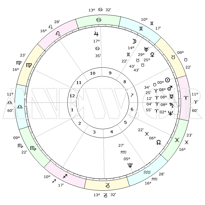 | | ΘΕΣΕΙΣ ΠΛΑΝΗΤΩΝ ΑΣΤΡΟΛΟΓΙΚΟΥ ΧΑΡΤΗ ΤΗΣ ΣΤΙΓΜΗΣ ΑΥΤΗΣ | | | | Πλανήτης | Ζώδιο | Μοίρες | Δεκαήμ. | Σε οίκο | Απόκλιση | | Ακμές των οίκων | | Ηλιος | Ταύρος | 00°31' | Πρώτο | 8 | 11 N 39 | | 1ος | 25°25' | Παρθένος | | Σελήνη | Δίδυμοι | 13°32' | Δεύτερο | 9 | 27 N 27 | | 2ος | 21°39' | Ζυγός | | Ερμής | Κριός | 08°07' | Πρώτο | 7 | 00 N 49 | | 3ος | 21°54' | Σκορπιός | | Αφροδίτη | Ταύρος | 25°39' | Τρίτο | 9 | 19 N 35 | | 4ος | 24°51' | Τοξότης | | Αρης | Κριός | 08°22' | Πρώτο | 7 | 02 N 27 | | 5ος | 27°54' | Αιγόκερως | | Δίας | Καρκίνος | 17°35' | Δεύτερο | 10 | 22 N 39 | | 6ος | 28°30' | Υδροχόος | | Κρόνος | Κριός | 08°03' | Πρώτο | 7 | 01 N 13 | | 7ος | 25°25' | Ιχθείς | | Ουρανός | Ταύρος | 29°43' | Τρίτο | 9 | 19 N 55 | | 8ος | 21°39' | Κριός | | Ποσειδώνας | Κριός | 02°55' | Πρώτο | 7 | 00 S 03 | | 9ος | 21°54' | Ταύρος | | Πλούτωνας | Υδροχόος | 05°27' | Πρώτο | 5 | 22 S 48 | | 10ος | 24°51' | Δίδυμοι | | Β. Δεσμός | Ιχθείς | 06°22' | Πρώτο | 6 | 09 S 10 | | 11ος | 27°54' | Καρκίνος | | Ωροσκόπος | Παρθένος | 25°25' | Τρίτο | | | 12ος | 28°30' | Λέων | | Μεσουράνημα | Δίδυμοι | 24°51' | Τρίτο | | | |