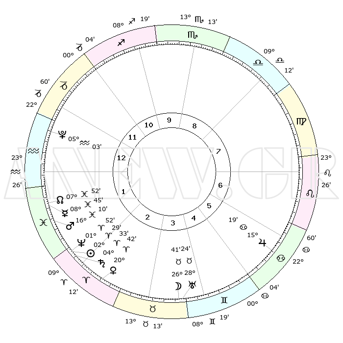 | | ΘΕΣΕΙΣ ΠΛΑΝΗΤΩΝ ΑΣΤΡΟΛΟΓΙΚΟΥ ΧΑΡΤΗ ΤΗΣ ΣΤΙΓΜΗΣ ΑΥΤΗΣ | | | | Πλανήτης | Ζώδιο | Μοίρες | Δεκαήμ. | Σε οίκο | Απόκλιση | | Ακμές των οίκων | | Ηλιος | Κριός | 02°25' | Πρώτο | 2 | 00 N 57 | | 1ος | 17°07' | Αιγόκερως | | Σελήνη | Ταύρος | 25°30' | Τρίτο | 4 | 24 N 04 | | 2ος | 28°35' | Υδροχόος | | Ερμής | Ιχθείς | 08°44' | Πρώτο | 2 | 07 S 52 | | 3ος | 08°34' | Κριός | | Αφροδίτη | Κριός | 20°35' | Τρίτο | 3 | 07 N 19 | | 4ος | 09°23' | Ταύρος | | Αρης | Ιχθείς | 16°06' | Δεύτερο | 2 | 06 S 28 | | 5ος | 03°21' | Δίδυμοι | | Δίας | Καρκίνος | 15°19' | Δεύτερο | 6 | 22 N 55 | | 6ος | 24°34' | Δίδυμοι | | Κρόνος | Κριός | 04°33' | Πρώτο | 2 | 00 S 09 | | 7ος | 17°07' | Καρκίνος | | Ουρανός | Ταύρος | 28°24' | Τρίτο | 4 | 19 N 38 | | 8ος | 28°35' | Λέων | | Ποσειδώνας | Κριός | 01°52' | Πρώτο | 2 | 00 S 27 | | 9ος | 08°34' | Ζυγός | | Πλούτωνας | Υδροχόος | 05°03' | Πρώτο | 1 | 22 S 48 | | 10ος | 09°23' | Σκορπιός | | Β. Δεσμός | Ιχθείς | 07°53' | Πρώτο | 2 | 08 S 37 | | 11ος | 03°21' | Τοξότης | | Ωροσκόπος | Αιγόκερως | 17°07' | Δεύτερο | | | 12ος | 24°34' | Τοξότης | | Μεσουράνημα | Σκορπιός | 09°23' | Πρώτο | | | |