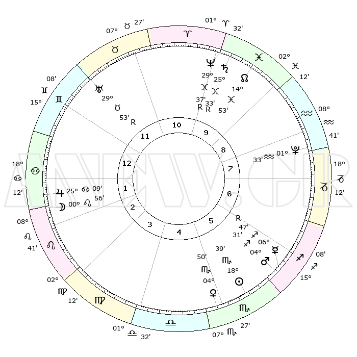 | | ΘΕΣΕΙΣ ΠΛΑΝΗΤΩΝ ΑΣΤΡΟΛΟΓΙΚΟΥ ΧΑΡΤΗ ΤΗΣ ΣΤΙΓΜΗΣ ΑΥΤΗΣ | | | | Πλανήτης | Ζώδιο | Μοίρες | Δεκαήμ. | Σε οίκο | Απόκλιση | | Ακμές των οίκων | | Ηλιος | Σκορπιός | 18°35' | Δεύτερο | 6 | 17 S 21 | | 1ος | 26°35' | Δίδυμοι | | Σελήνη | Λέων | 00°00' | Πρώτο | 2 | 23 N 44 | | 2ος | 17°37' | Καρκίνος | | Ερμής | Τοξότης | 06°48'R | Πρώτο | 6 | 23 S 37 | | 3ος | 09°13' | Λέων | | Αφροδίτη | Σκορπιός | 04°45' | Πρώτο | 5 | 11 S 52 | | 4ος | 05°00' | Παρθένος | | Αρης | Τοξότης | 04°28' | Πρώτο | 6 | 21 S 30 | | 5ος | 08°22' | Ζυγός | | Δίας | Καρκίνος | 25°09' | Τρίτο | 2 | 21 N 12 | | 6ος | 18°34' | Σκορπιός | | Κρόνος | Ιχθείς | 25°33'R | Τρίτο | 10 | 04 S 00 | | 7ος | 26°35' | Τοξότης | | Ουρανός | Ταύρος | 29°53'R | Τρίτο | 12 | 19 N 55 | | 8ος | 17°37' | Αιγόκερως | | Ποσειδώνας | Ιχθείς | 29°37'R | Τρίτο | 10 | 01 S 24 | | 9ος | 09°13' | Υδροχόος | | Πλούτωνας | Υδροχόος | 01°33' | Πρώτο | 8 | 23 S 29 | | 10ος | 05°00' | Ιχθείς | | Β. Δεσμός | Ιχθείς | 14°53' | Δεύτερο | 10 | 05 S 57 | | 11ος | 08°22' | Κριός | | Ωροσκόπος | Δίδυμοι | 26°35' | Τρίτο | | | 12ος | 18°34' | Ταύρος | | Μεσουράνημα | Ιχθείς | 05°00' | Πρώτο | | | |
