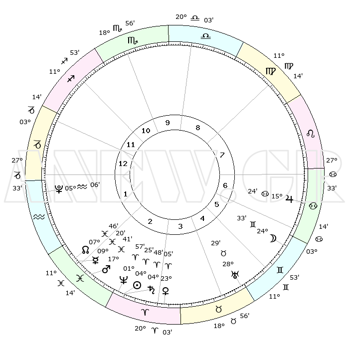 | | ΘΕΣΕΙΣ ΠΛΑΝΗΤΩΝ ΑΣΤΡΟΛΟΓΙΚΟΥ ΧΑΡΤΗ ΤΗΣ ΣΤΙΓΜΗΣ ΑΥΤΗΣ | | | | Πλανήτης | Ζώδιο | Μοίρες | Δεκαήμ. | Σε οίκο | Απόκλιση | | Ακμές των οίκων | | Ηλιος | Κριός | 04°21' | Πρώτο | 3 | 01 N 44 | | 1ος | 01°05' | Αιγόκερως | | Σελήνη | Δίδυμοι | 23°32' | Τρίτο | 6 | 28 N 19 | | 2ος | 08°31' | Υδροχόος | | Ερμής | Ιχθείς | 09°18' | Πρώτο | 2 | 08 S 04 | | 3ος | 18°35' | Ιχθείς | | Αφροδίτη | Κριός | 22°60' | Τρίτο | 4 | 08 N 16 | | 4ος | 22°21' | Κριός | | Αρης | Ιχθείς | 17°38' | Δεύτερο | 2 | 05 S 52 | | 5ος | 18°30' | Ταύρος | | Δίας | Καρκίνος | 15°24' | Δεύτερο | 7 | 22 N 54 | | 6ος | 10°13' | Δίδυμοι | | Κρόνος | Κριός | 04°47' | Πρώτο | 3 | 00 S 03 | | 7ος | 01°05' | Καρκίνος | | Ουρανός | Ταύρος | 28°28' | Τρίτο | 5 | 19 N 39 | | 8ος | 08°31' | Λέων | | Ποσειδώνας | Κριός | 01°57' | Πρώτο | 3 | 00 S 26 | | 9ος | 18°35' | Παρθένος | | Πλούτωνας | Υδροχόος | 05°06' | Πρώτο | 1 | 22 S 48 | | 10ος | 22°21' | Ζυγός | | Β. Δεσμός | Ιχθείς | 07°46' | Πρώτο | 2 | 08 S 39 | | 11ος | 18°30' | Σκορπιός | | Ωροσκόπος | Αιγόκερως | 01°05' | Πρώτο | | | 12ος | 10°13' | Τοξότης | | Μεσουράνημα | Ζυγός | 22°21' | Τρίτο | | | |