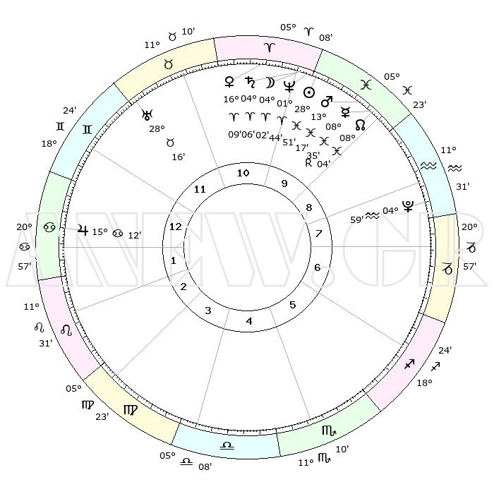 | | ΘΕΣΕΙΣ ΠΛΑΝΗΤΩΝ ΑΣΤΡΟΛΟΓΙΚΟΥ ΧΑΡΤΗ ΤΗΣ ΣΤΙΓΜΗΣ ΑΥΤΗΣ | | | | Πλανήτης | Ζώδιο | Μοίρες | Δεκαήμ. | Σε οίκο | Απόκλιση | | Ακμές των οίκων | | Ηλιος | Ιχθείς | 28°47' | Τρίτο | 10 | 00 S 29 | | 1ος | 28°17' | Δίδυμοι | | Σελήνη | Κριός | 03°01' | Πρώτο | 10 | 03 N 10 | | 2ος | 19°11' | Καρκίνος | | Ερμής | Ιχθείς | 08°36'R | Πρώτο | 10 | 07 S 06 | | 3ος | 10°52' | Λέων | | Αφροδίτη | Κριός | 16°04' | Δεύτερο | 11 | 05 N 29 | | 4ος | 06°55' | Παρθένος | | Αρης | Ιχθείς | 13°14' | Δεύτερο | 10 | 07 S 35 | | 5ος | 10°35' | Ζυγός | | Δίας | Καρκίνος | 15°12' | Δεύτερο | 1 | 22 N 56 | | 6ος | 20°41' | Σκορπιός | | Κρόνος | Κριός | 04°05' | Πρώτο | 10 | 00 S 20 | | 7ος | 28°16' | Τοξότης | | Ουρανός | Ταύρος | 28°16' | Τρίτο | 12 | 19 N 36 | | 8ος | 19°11' | Αιγόκερως | | Ποσειδώνας | Κριός | 01°44' | Πρώτο | 10 | 00 S 31 | | 9ος | 10°52' | Υδροχόος | | Πλούτωνας | Υδροχόος | 04°59' | Πρώτο | 8 | 22 S 49 | | 10ος | 06°55' | Ιχθείς | | Β. Δεσμός | Ιχθείς | 08°04' | Πρώτο | 10 | 08 S 32 | | 11ος | 10°35' | Κριός | | Ωροσκόπος | Δίδυμοι | 28°17' | Τρίτο | | | 12ος | 20°41' | Ταύρος | | Μεσουράνημα | Ιχθείς | 06°55' | Πρώτο | | | |