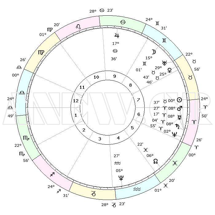 | | ΘΕΣΕΙΣ ΠΛΑΝΗΤΩΝ ΑΣΤΡΟΛΟΓΙΚΟΥ ΧΑΡΤΗ ΤΗΣ ΣΤΙΓΜΗΣ ΑΥΤΗΣ | | | | Πλανήτης | Ζώδιο | Μοίρες | Δεκαήμ. | Σε οίκο | Απόκλιση | | Ακμές των οίκων | | Ηλιος | Ταύρος | 00°33' | Πρώτο | 7 | 11 N 40 | | 1ος | 06°16' | Ζυγός | | Σελήνη | Δίδυμοι | 14°05' | Δεύτερο | 9 | 27 N 31 | | 2ος | 03°17' | Σκορπιός | | Ερμής | Κριός | 08°11' | Πρώτο | 7 | 00 N 51 | | 3ος | 03°58' | Τοξότης | | Αφροδίτη | Ταύρος | 25°42' | Τρίτο | 8 | 19 N 36 | | 4ος | 07°03' | Αιγόκερως | | Αρης | Κριός | 08°24' | Πρώτο | 7 | 02 N 27 | | 5ος | 09°59' | Υδροχόος | | Δίας | Καρκίνος | 17°35' | Δεύτερο | 10 | 22 N 39 | | 6ος | 10°10' | Ιχθείς | | Κρόνος | Κριός | 08°04' | Πρώτο | 7 | 01 N 13 | | 7ος | 06°16' | Κριός | | Ουρανός | Ταύρος | 29°43' | Τρίτο | 8 | 19 N 55 | | 8ος | 03°17' | Ταύρος | | Ποσειδώνας | Κριός | 02°55' | Πρώτο | 6 | 00 S 03 | | 9ος | 03°58' | Δίδυμοι | | Πλούτωνας | Υδροχόος | 05°27' | Πρώτο | 4 | 22 S 48 | | 10ος | 07°03' | Καρκίνος | | Β. Δεσμός | Ιχθείς | 06°22' | Πρώτο | 5 | 09 S 10 | | 11ος | 09°59' | Λέων | | Ωροσκόπος | Ζυγός | 06°16' | Πρώτο | | | 12ος | 10°10' | Παρθένος | | Μεσουράνημα | Καρκίνος | 07°03' | Πρώτο | | | |