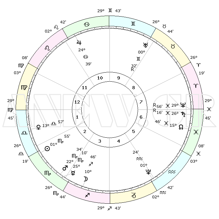 | | ΘΕΣΕΙΣ ΠΛΑΝΗΤΩΝ ΑΣΤΡΟΛΟΓΙΚΟΥ ΧΑΡΤΗ ΤΗΣ ΣΤΙΓΜΗΣ ΑΥΤΗΣ | | | | Πλανήτης | Ζώδιο | Μοίρες | Δεκαήμ. | Σε οίκο | Απόκλιση | | Ακμές των οίκων | | Ηλιος | Σκορπιός | 01°26' | Πρώτο | 7 | 11 S 58 | | 1ος | 01°08' | Κριός | | Σελήνη | Τοξότης | 04°54' | Πρώτο | 8 | 26 S 02 | | 2ος | 11°09' | Ταύρος | | Ερμής | Σκορπιός | 24°35' | Τρίτο | 8 | 21 S 26 | | 3ος | 08°23' | Δίδυμοι | | Αφροδίτη | Ζυγός | 13°20' | Δεύτερο | 7 | 03 S 51 | | 4ος | 00°38' | Καρκίνος | | Αρης | Σκορπιός | 22°14' | Τρίτο | 8 | 18 S 38 | | 5ος | 22°60' | Καρκίνος | | Δίας | Καρκίνος | 24°37' | Τρίτο | 5 | 21 N 16 | | 6ος | 20°34' | Λέων | | Κρόνος | Ιχθείς | 26°18'R | Τρίτο | 12 | 03 S 45 | | 7ος | 01°08' | Ζυγός | | Ουρανός | Δίδυμοι | 00°33'R | Πρώτο | 2 | 20 N 03 | | 8ος | 11°09' | Σκορπιός | | Ποσειδώνας | Ιχθείς | 29°57'R | Τρίτο | 12 | 01 S 17 | | 9ος | 08°23' | Τοξότης | | Πλούτωνας | Υδροχόος | 01°24' | Πρώτο | 11 | 23 S 32 | | 10ος | 00°38' | Αιγόκερως | | Β. Δεσμός | Ιχθείς | 15°48' | Δεύτερο | 12 | 05 S 36 | | 11ος | 22°60' | Αιγόκερως | | Ωροσκόπος | Κριός | 01°08' | Πρώτο | | | 12ος | 20°34' | Υδροχόος | | Μεσουράνημα | Αιγόκερως | 00°38' | Πρώτο | | | |