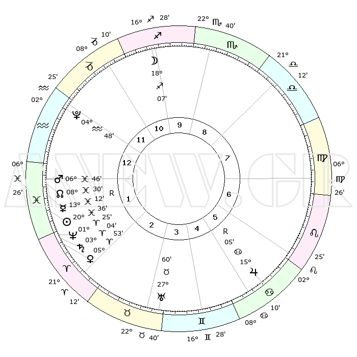| | ΘΕΣΕΙΣ ΠΛΑΝΗΤΩΝ ΑΣΤΡΟΛΟΓΙΚΟΥ ΧΑΡΤΗ ΤΗΣ ΣΤΙΓΜΗΣ ΑΥΤΗΣ | | | | Πλανήτης | Ζώδιο | Μοίρες | Δεκαήμ. | Σε οίκο | Απόκλιση | | Ακμές των οίκων | | Ηλιος | Ιχθείς | 20°32' | Τρίτο | 2 | 03 S 45 | | 1ος | 02°34' | Υδροχόος | | Σελήνη | Τοξότης | 17°19' | Δεύτερο | 11 | 28 S 01 | | 2ος | 17°04' | Ιχθείς | | Ερμής | Ιχθείς | 13°16'R | Δεύτερο | 1 | 03 S 36 | | 3ος | 25°06' | Κριός | | Αφροδίτη | Κριός | 05°48' | Πρώτο | 2 | 01 N 15 | | 4ος | 23°08' | Ταύρος | | Αρης | Ιχθείς | 06°43' | Πρώτο | 1 | 10 S 03 | | 5ος | 15°43' | Δίδυμοι | | Δίας | Καρκίνος | 15°05'R | Δεύτερο | 6 | 22 N 56 | | 6ος | 07°14' | Καρκίνος | | Κρόνος | Κριός | 03°04' | Πρώτο | 2 | 00 S 44 | | 7ος | 02°34' | Λέων | | Ουρανός | Ταύρος | 27°60' | Τρίτο | 4 | 19 N 32 | | 8ος | 17°04' | Παρθένος | | Ποσειδώνας | Κριός | 01°25' | Πρώτο | 2 | 00 S 38 | | 9ος | 25°06' | Ζυγός | | Πλούτωνας | Υδροχόος | 04°48' | Πρώτο | 1 | 22 S 50 | | 10ος | 23°08' | Σκορπιός | | Β. Δεσμός | Ιχθείς | 08°31' | Πρώτο | 1 | 08 S 23 | | 11ος | 15°43' | Τοξότης | | Ωροσκόπος | Υδροχόος | 02°34' | Πρώτο | | | 12ος | 07°14' | Αιγόκερως | | Μεσουράνημα | Σκορπιός | 23°08' | Τρίτο | | | |