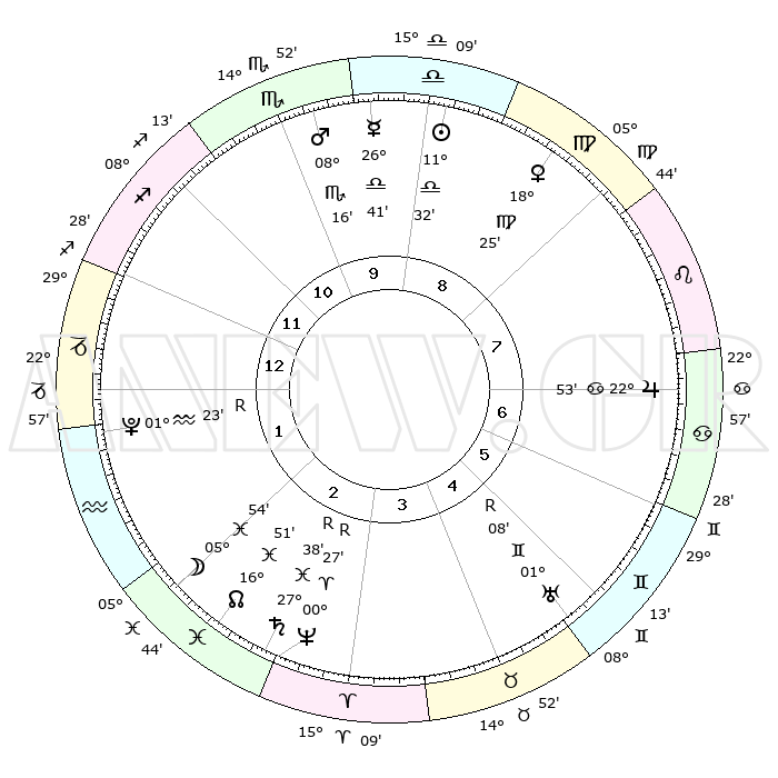 | ΘΕΣΕΙΣ ΠΛΑΝΗΤΩΝ ΑΣΤΡΟΛΟΓΙΚΟΥ ΧΑΡΤΗ ΤΗΣ ΣΤΙΓΜΗΣ ΑΥΤΗΣ | | Πλανήτης | Ζώδιο | Μοίρες | Δεκαήμ. | Σε οίκο | Απόκλιση | | Ακμές των οίκων | Ηλιος | Ζυγός | 11°25' | Δεύτερο | 10 | 04 S 31 | | 1ος | 13°39' | Τοξότης | Σελήνη | Ιχθείς | 04°17' | Πρώτο | 3 | 11 S 07 | | 2ος | 17°04' | Αιγόκερως | Ερμής | Ζυγός | 26°31' | Τρίτο | 10 | 10 S 42 | | 3ος | 25°03' | Υδροχόος | Αφροδίτη | Παρθένος | 18°16' | Δεύτερο | 9 | 05 N 53 | | 4ος | 00°52' | Κριός | Αρης | Σκορπιός | 08°12' | Πρώτο | 11 | 14 S 21 | | 5ος | 29°54' | Κριός | Δίας | Καρκίνος | 22°52' | Τρίτο | 8 | 21 N 31 | | 6ος | 23°12' | Ταύρος | Κρόνος | Ιχθείς | 27°38'R | Τρίτο | 3 | 03 S 15 | | 7ος | 13°39' | Δίδυμοι | Ουρανός | Δίδυμοι | 01°08'R | Πρώτο | 6 | 20 N 11 | | 8ος | 17°04' | Καρκίνος | Ποσειδώνας | Κριός | 00°27'R | Πρώτο | 3 | 01 S 05 | | 9ος | 25°03' | Λέων | Πλούτωνας | Υδροχόος | 01°23'R | Πρώτο | 2 | 23 S 32 | | 10ος | 00°52' | Ζυγός | Β. Δεσμός | Ιχθείς | 16°52' | Δεύτερο | 3 | 05 S 11 | | 11ος | 29°54' | Ζυγός | Ωροσκόπος | Τοξότης | 13°39' | Δεύτερο | | | 12ος | 23°12' | Σκορπιός | Μεσουράνημα | Ζυγός | 00°52' | Πρώτο | | | |