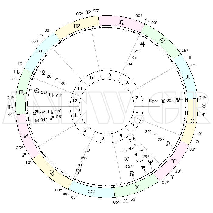 | | ΘΕΣΕΙΣ ΠΛΑΝΗΤΩΝ ΑΣΤΡΟΛΟΓΙΚΟΥ ΧΑΡΤΗ ΤΗΣ ΣΤΙΓΜΗΣ ΑΥΤΗΣ | | | | Πλανήτης | Ζώδιο | Μοίρες | Δεκαήμ. | Σε οίκο | Απόκλιση | | Ακμές των οίκων | | Ηλιος | Σκορπιός | 11°47' | Δεύτερο | 3 | 15 S 22 | | 1ος | 00°15' | Παρθένος | | Σελήνη | Κριός | 19°12' | Δεύτερο | 8 | 10 N 02 | | 2ος | 24°08' | Παρθένος | | Ερμής | Τοξότης | 04°44' | Πρώτο | 4 | 23 S 54 | | 3ος | 22°50' | Ζυγός | | Αφροδίτη | Ζυγός | 26°17' | Τρίτο | 3 | 08 S 48 | | 4ος | 25°45' | Σκορπιός | | Αρης | Σκορπιός | 29°36' | Τρίτο | 4 | 20 S 28 | | 5ος | 29°55' | Τοξότης | | Δίας | Καρκίνος | 25°03' | Τρίτο | 11 | 21 N 12 | | 6ος | 01°51' | Υδροχόος | | Κρόνος | Ιχθείς | 25°48'R | Τρίτο | 8 | 03 S 56 | | 7ος | 00°15' | Ιχθείς | | Ουρανός | Δίδυμοι | 00°09'R | Πρώτο | 10 | 19 N 58 | | 8ος | 24°08' | Ιχθείς | | Ποσειδώνας | Ιχθείς | 29°44'R | Τρίτο | 8 | 01 S 22 | | 9ος | 22°50' | Κριός | | Πλούτωνας | Υδροχόος | 01°28' | Πρώτο | 5 | 23 S 30 | | 10ος | 25°45' | Ταύρος | | Β. Δεσμός | Ιχθείς | 15°15' | Δεύτερο | 7 | 05 S 49 | | 11ος | 29°55' | Δίδυμοι | | Ωροσκόπος | Παρθένος | 00°15' | Πρώτο | | | 12ος | 01°51' | Λέων | | Μεσουράνημα | Ταύρος | 25°45' | Τρίτο | | | |