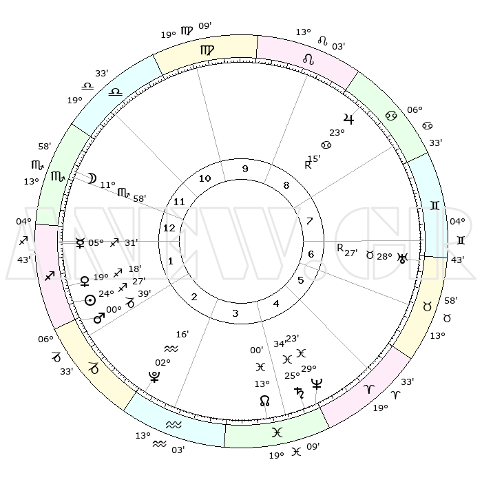 | | ΘΕΣΕΙΣ ΠΛΑΝΗΤΩΝ ΑΣΤΡΟΛΟΓΙΚΟΥ ΧΑΡΤΗ ΤΗΣ ΣΤΙΓΜΗΣ ΑΥΤΗΣ | | | | Πλανήτης | Ζώδιο | Μοίρες | Δεκαήμ. | Σε οίκο | Απόκλιση | | Ακμές των οίκων | | Ηλιος | Τοξότης | 24°05' | Τρίτο | 5 | 23 S 18 | | 1ος | 20°48' | Λέων | | Σελήνη | Σκορπιός | 07°45' | Πρώτο | 3 | 17 S 58 | | 2ος | 13°42' | Παρθένος | | Ερμής | Τοξότης | 05°02' | Πρώτο | 4 | 19 S 43 | | 3ος | 11°26' | Ζυγός | | Αφροδίτη | Τοξότης | 18°51' | Δεύτερο | 4 | 22 S 50 | | 4ος | 14°08' | Σκορπιός | | Αρης | Αιγόκερως | 00°23' | Πρώτο | 5 | 24 S 13 | | 5ος | 18°59' | Τοξότης | | Δίας | Καρκίνος | 23°17'R | Τρίτο | 12 | 21 N 37 | | 6ος | 21°47' | Αιγόκερως | | Κρόνος | Ιχθείς | 25°33' | Τρίτο | 8 | 03 S 53 | | 7ος | 20°48' | Υδροχόος | | Ουρανός | Ταύρος | 28°28'R | Τρίτο | 10 | 19 N 37 | | 8ος | 13°42' | Ιχθείς | | Ποσειδώνας | Ιχθείς | 29°23' | Τρίτο | 8 | 01 S 29 | | 9ος | 11°26' | Κριός | | Πλούτωνας | Υδροχόος | 02°16' | Πρώτο | 6 | 23 S 19 | | 10ος | 14°08' | Ταύρος | | Β. Δεσμός | Ιχθείς | 13°02' | Δεύτερο | 7 | 06 S 40 | | 11ος | 18°59' | Δίδυμοι | | Ωροσκόπος | Λέων | 20°48' | Τρίτο | | | 12ος | 21°47' | Καρκίνος | | Μεσουράνημα | Ταύρος | 14°08' | Δεύτερο | | | |