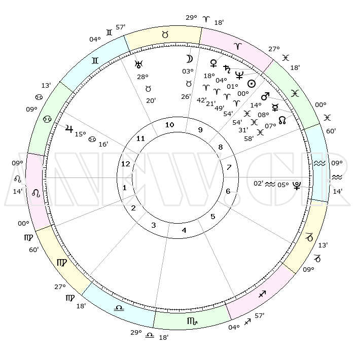 | | ΘΕΣΕΙΣ ΠΛΑΝΗΤΩΝ ΑΣΤΡΟΛΟΓΙΚΟΥ ΧΑΡΤΗ ΤΗΣ ΣΤΙΓΜΗΣ ΑΥΤΗΣ | | | | Πλανήτης | Ζώδιο | Μοίρες | Δεκαήμ. | Σε οίκο | Απόκλιση | | Ακμές των οίκων | | Ηλιος | Κριός | 00°50' | Πρώτο | 9 | 00 N 20 | | 1ος | 17°60' | Καρκίνος | | Σελήνη | Ταύρος | 02°24' | Πρώτο | 10 | 16 N 16 | | 2ος | 08°29' | Λέων | | Ερμής | Ιχθείς | 08°31' | Πρώτο | 9 | 07 S 36 | | 3ος | 01°59' | Παρθένος | | Αφροδίτη | Κριός | 18°37' | Δεύτερο | 10 | 06 N 31 | | 4ος | 01°17' | Ζυγός | | Αρης | Ιχθείς | 14°51' | Δεύτερο | 9 | 06 S 57 | | 5ος | 07°11' | Σκορπιός | | Δίας | Καρκίνος | 15°15' | Δεύτερο | 12 | 22 N 55 | | 6ος | 14°54' | Τοξότης | | Κρόνος | Κριός | 04°21' | Πρώτο | 10 | 00 S 13 | | 7ος | 17°60' | Αιγόκερως | | Ουρανός | Ταύρος | 28°20' | Τρίτο | 11 | 19 N 37 | | 8ος | 08°29' | Υδροχόος | | Ποσειδώνας | Κριός | 01°49' | Πρώτο | 10 | 00 S 29 | | 9ος | 01°59' | Ιχθείς | | Πλούτωνας | Υδροχόος | 05°01' | Πρώτο | 7 | 22 S 48 | | 10ος | 01°17' | Κριός | | Β. Δεσμός | Ιχθείς | 07°58' | Πρώτο | 9 | 08 S 35 | | 11ος | 07°11' | Ταύρος | | Ωροσκόπος | Καρκίνος | 17°60' | Δεύτερο | | | 12ος | 14°54' | Δίδυμοι | | Μεσουράνημα | Κριός | 01°17' | Πρώτο | | | |