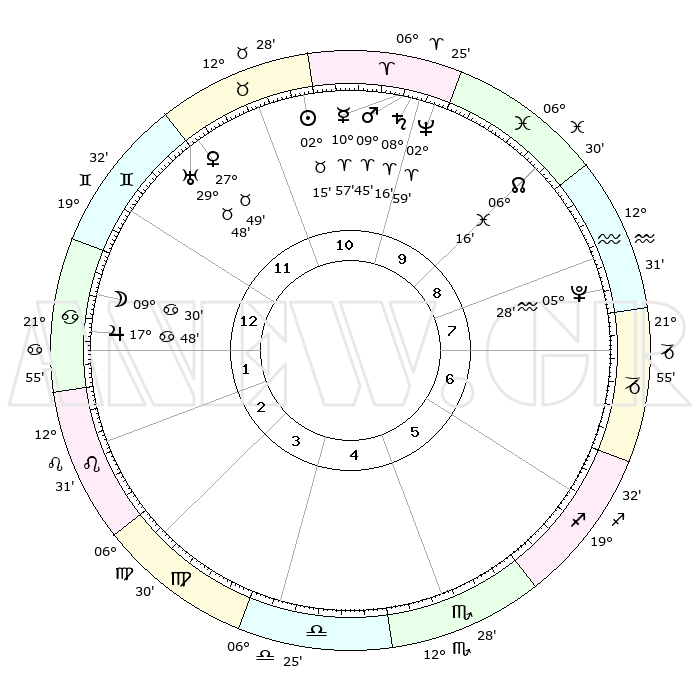 | | ΘΕΣΕΙΣ ΠΛΑΝΗΤΩΝ ΑΣΤΡΟΛΟΓΙΚΟΥ ΧΑΡΤΗ ΤΗΣ ΣΤΙΓΜΗΣ ΑΥΤΗΣ | | | | Πλανήτης | Ζώδιο | Μοίρες | Δεκαήμ. | Σε οίκο | Απόκλιση | | Ακμές των οίκων | | Ηλιος | Ταύρος | 01°26' | Πρώτο | 9 | 11 N 58 | | 1ος | 06°25' | Παρθένος | | Σελήνη | Δίδυμοι | 27°16' | Τρίτο | 10 | 28 N 12 | | 2ος | 00°57' | Ζυγός | | Ερμής | Κριός | 09°36' | Πρώτο | 8 | 01 N 25 | | 3ος | 00°09' | Σκορπιός | | Αφροδίτη | Ταύρος | 26°47' | Τρίτο | 9 | 19 N 54 | | 4ος | 03°06' | Τοξότης | | Αρης | Κριός | 09°05' | Πρώτο | 8 | 02 N 44 | | 5ος | 06°53' | Αιγόκερως | | Δίας | Καρκίνος | 17°41' | Δεύτερο | 11 | 22 N 39 | | 6ος | 08°23' | Υδροχόος | | Κρόνος | Κριός | 08°10' | Πρώτο | 8 | 01 N 15 | | 7ος | 06°25' | Ιχθείς | | Ουρανός | Ταύρος | 29°46' | Τρίτο | 9 | 19 N 56 | | 8ος | 00°57' | Κριός | | Ποσειδώνας | Κριός | 02°57' | Πρώτο | 8 | 00 S 02 | | 9ος | 00°09' | Ταύρος | | Πλούτωνας | Υδροχόος | 05°27' | Πρώτο | 5 | 22 S 48 | | 10ος | 03°06' | Δίδυμοι | | Β. Δεσμός | Ιχθείς | 06°19' | Πρώτο | 6 | 09 S 12 | | 11ος | 06°53' | Καρκίνος | | Ωροσκόπος | Παρθένος | 06°25' | Πρώτο | | | 12ος | 08°23' | Λέων | | Μεσουράνημα | Δίδυμοι | 03°06' | Πρώτο | | | |