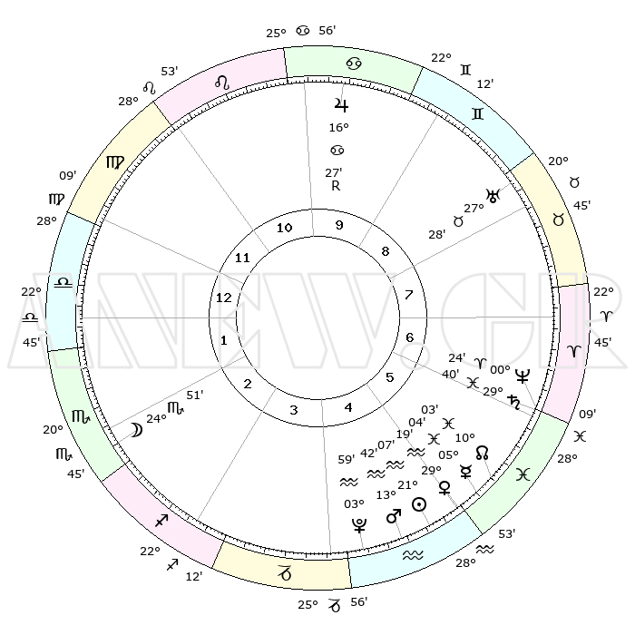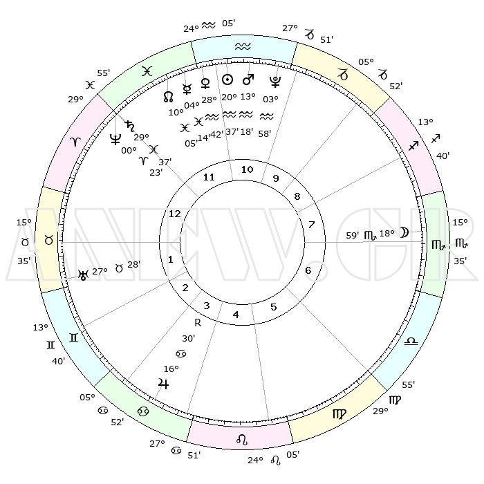 | | ΘΕΣΕΙΣ ΠΛΑΝΗΤΩΝ ΑΣΤΡΟΛΟΓΙΚΟΥ ΧΑΡΤΗ ΤΗΣ ΣΤΙΓΜΗΣ ΑΥΤΗΣ | | | | Πλανήτης | Ζώδιο | Μοίρες | Δεκαήμ. | Σε οίκο | Απόκλιση | | Ακμές των οίκων | | Ηλιος | Υδροχόος | 20°02' | Τρίτο | 5 | 14 S 48 | | 1ος | 28°03' | Παρθένος | | Σελήνη | Σκορπιός | 11°58' | Δεύτερο | 2 | 19 S 52 | | 2ος | 24°29' | Ζυγός | | Ερμής | Ιχθείς | 03°13' | Πρώτο | 6 | 11 S 20 | | 3ος | 24°51' | Σκορπιός | | Αφροδίτη | Υδροχόος | 27°58' | Τρίτο | 5 | 13 S 32 | | 4ος | 27°48' | Τοξότης | | Αρης | Υδροχόος | 12°51' | Δεύτερο | 5 | 17 S 58 | | 5ος | 00°48' | Υδροχόος | | Δίας | Καρκίνος | 16°33'R | Δεύτερο | 10 | 22 N 43 | | 6ος | 01°19' | Ιχθείς | | Κρόνος | Ιχθείς | 29°33' | Τρίτο | 7 | 02 S 10 | | 7ος | 28°03' | Ιχθείς | | Ουρανός | Ταύρος | 27°28' | Τρίτο | 9 | 19 N 24 | | 8ος | 24°29' | Κριός | | Ποσειδώνας | Κριός | 00°22' | Πρώτο | 7 | 01 S 03 | | 9ος | 24°51' | Ταύρος | | Πλούτωνας | Υδροχόος | 03°57' | Πρώτο | 5 | 22 S 59 | | 10ος | 27°48' | Δίδυμοι | | Β. Δεσμός | Ιχθείς | 10°07' | Δεύτερο | 6 | 07 S 46 | | 11ος | 00°48' | Λέων | | Ωροσκόπος | Παρθένος | 28°03' | Τρίτο | | | 12ος | 01°19' | Παρθένος | | Μεσουράνημα | Δίδυμοι | 27°48' | Τρίτο | | | |