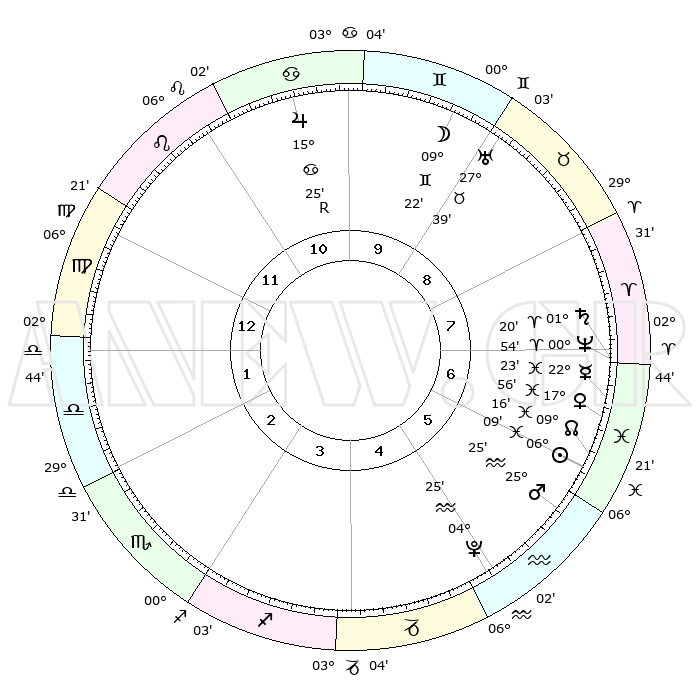 | | ΘΕΣΕΙΣ ΠΛΑΝΗΤΩΝ ΑΣΤΡΟΛΟΓΙΚΟΥ ΧΑΡΤΗ ΤΗΣ ΣΤΙΓΜΗΣ ΑΥΤΗΣ | | | | Πλανήτης | Ζώδιο | Μοίρες | Δεκαήμ. | Σε οίκο | Απόκλιση | | Ακμές των οίκων | | Ηλιος | Ιχθείς | 06°06' | Πρώτο | 6 | 09 S 16 | | 1ος | 15°21' | Παρθένος | | Σελήνη | Δίδυμοι | 08°32' | Πρώτο | 9 | 26 N 56 | | 2ος | 10°43' | Ζυγός | | Ερμής | Ιχθείς | 22°22' | Τρίτο | 7 | 00 S 48 | | 3ος | 10°30' | Σκορπιός | | Αφροδίτη | Ιχθείς | 17°52' | Δεύτερο | 7 | 06 S 06 | | 4ος | 13°26' | Τοξότης | | Αρης | Υδροχόος | 25°22' | Τρίτο | 6 | 14 S 05 | | 5ος | 16°47' | Αιγόκερως | | Δίας | Καρκίνος | 15°25'R | Δεύτερο | 10 | 22 N 53 | | 6ος | 17°49' | Υδροχόος | | Κρόνος | Κριός | 01°20' | Πρώτο | 7 | 01 S 26 | | 7ος | 15°21' | Ιχθείς | | Ουρανός | Ταύρος | 27°39' | Τρίτο | 9 | 19 N 27 | | 8ος | 10°44' | Κριός | | Ποσειδώνας | Κριός | 00°54' | Πρώτο | 7 | 00 S 51 | | 9ος | 10°30' | Ταύρος | | Πλούτωνας | Υδροχόος | 04°25' | Πρώτο | 5 | 22 S 54 | | 10ος | 13°26' | Δίδυμοι | | Β. Δεσμός | Ιχθείς | 09°16' | Πρώτο | 6 | 08 S 05 | | 11ος | 16°47' | Καρκίνος | | Ωροσκόπος | Παρθένος | 15°21' | Δεύτερο | | | 12ος | 17°49' | Λέων | | Μεσουράνημα | Δίδυμοι | 13°26' | Δεύτερο | | | |