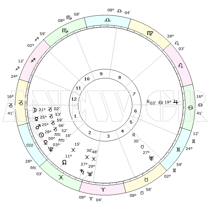 | | ΘΕΣΕΙΣ ΠΛΑΝΗΤΩΝ ΑΣΤΡΟΛΟΓΙΚΟΥ ΧΑΡΤΗ ΤΗΣ ΣΤΙΓΜΗΣ ΑΥΤΗΣ | | | | Πλανήτης | Ζώδιο | Μοίρες | Δεκαήμ. | Σε οίκο | Απόκλιση | | Ακμές των οίκων | | Ηλιος | Αιγόκερως | 28°02' | Τρίτο | 1 | 20 S 33 | | 1ος | 23°44' | Τοξότης | | Σελήνη | Αιγόκερως | 20°12' | Τρίτο | 1 | 25 S 47 | | 2ος | 29°21' | Αιγόκερως | | Ερμής | Αιγόκερως | 25°47' | Τρίτο | 1 | 22 S 54 | | 3ος | 08°46' | Ιχθείς | | Αφροδίτη | Υδροχόος | 00°47' | Πρώτο | 2 | 21 S 01 | | 4ος | 13°36' | Κριός | | Αρης | Αιγόκερως | 25°56' | Τρίτο | 1 | 21 S 55 | | 5ος | 10°57' | Ταύρος | | Δίας | Καρκίνος | 19°04'R | Δεύτερο | 7 | 22 N 21 | | 6ος | 03°13' | Δίδυμοι | | Κρόνος | Ιχθείς | 27°30' | Τρίτο | 3 | 03 S 01 | | 7ος | 23°44' | Δίδυμοι | | Ουρανός | Ταύρος | 27°35'R | Τρίτο | 5 | 19 N 26 | | 8ος | 29°21' | Καρκίνος | | Ποσειδώνας | Ιχθείς | 29°48' | Τρίτο | 3 | 01 S 18 | | 9ος | 08°46' | Παρθένος | | Πλούτωνας | Υδροχόος | 03°15' | Πρώτο | 2 | 23 S 06 | | 10ος | 13°36' | Ζυγός | | Β. Δεσμός | Ιχθείς | 11°16' | Δεύτερο | 3 | 07 S 20 | | 11ος | 10°57' | Σκορπιός | | Ωροσκόπος | Τοξότης | 23°44' | Τρίτο | | | 12ος | 03°13' | Τοξότης | | Μεσουράνημα | Ζυγός | 13°36' | Δεύτερο | | | |