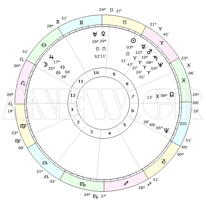 | | ΘΕΣΕΙΣ ΠΛΑΝΗΤΩΝ ΑΣΤΡΟΛΟΓΙΚΟΥ ΧΑΡΤΗ ΤΗΣ ΣΤΙΓΜΗΣ ΑΥΤΗΣ | | | | Πλανήτης | Ζώδιο | Μοίρες | Δεκαήμ. | Σε οίκο | Απόκλιση | | Ακμές των οίκων | | Ηλιος | Ταύρος | 03°03' | Πρώτο | 12 | 12 N 32 | | 1ος | 17°35' | Ταύρος | | Σελήνη | Καρκίνος | 21°08' | Τρίτο | 3 | 25 N 25 | | 2ος | 15°11' | Δίδυμοι | | Ερμής | Κριός | 12°17' | Δεύτερο | 12 | 02 N 32 | | 3ος | 07°14' | Καρκίνος | | Αφροδίτη | Ταύρος | 28°49' | Τρίτο | 1 | 20 N 25 | | 4ος | 29°18' | Καρκίνος | | Αρης | Κριός | 10°22' | Δεύτερο | 12 | 03 N 15 | | 5ος | 25°48' | Λέων | | Δίας | Καρκίνος | 17°54' | Δεύτερο | 3 | 22 N 37 | | 6ος | 02°02' | Ζυγός | | Κρόνος | Κριός | 08°22' | Πρώτο | 12 | 01 N 20 | | 7ος | 17°35' | Σκορπιός | | Ουρανός | Ταύρος | 29°51' | Τρίτο | 1 | 19 N 57 | | 8ος | 15°11' | Τοξότης | | Ποσειδώνας | Κριός | 03°00' | Πρώτο | 12 | 00 S 01 | | 9ος | 07°14' | Αιγόκερως | | Πλούτωνας | Υδροχόος | 05°28' | Πρώτο | 10 | 22 S 48 | | 10ος | 29°18' | Αιγόκερως | | Β. Δεσμός | Ιχθείς | 06°14' | Πρώτο | 11 | 09 S 13 | | 11ος | 25°48' | Υδροχόος | | Ωροσκόπος | Ταύρος | 17°35' | Δεύτερο | | | 12ος | 02°02' | Κριός | | Μεσουράνημα | Αιγόκερως | 29°18' | Τρίτο | | | |