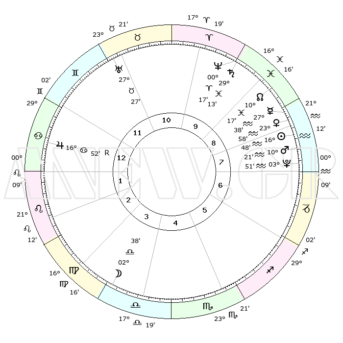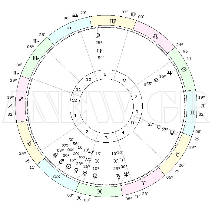 | | ΘΕΣΕΙΣ ΠΛΑΝΗΤΩΝ ΑΣΤΡΟΛΟΓΙΚΟΥ ΧΑΡΤΗ ΤΗΣ ΣΤΙΓΜΗΣ ΑΥΤΗΣ | | | | Πλανήτης | Ζώδιο | Μοίρες | Δεκαήμ. | Σε οίκο | Απόκλιση | | Ακμές των οίκων | | Ηλιος | Υδροχόος | 16°44' | Δεύτερο | 8 | 15 S 49 | | 1ος | 13°21' | Καρκίνος | | Σελήνη | Ζυγός | 01°54' | Πρώτο | 4 | 02 S 38 | | 2ος | 03°46' | Λέων | | Ερμής | Υδροχόος | 27°32' | Τρίτο | 9 | 13 S 44 | | 3ος | 26°44' | Λέων | | Αφροδίτη | Υδροχόος | 23°53' | Τρίτο | 8 | 14 S 54 | | 4ος | 25°16' | Παρθένος | | Αρης | Υδροχόος | 10°18' | Δεύτερο | 8 | 18 S 40 | | 5ος | 00°52' | Σκορπιός | | Δίας | Καρκίνος | 16°52'R | Δεύτερο | 1 | 22 N 41 | | 6ος | 09°19' | Τοξότης | | Κρόνος | Ιχθείς | 29°13' | Τρίτο | 10 | 02 S 18 | | 7ος | 13°21' | Αιγόκερως | | Ουρανός | Ταύρος | 27°27' | Τρίτο | 11 | 19 N 24 | | 8ος | 03°46' | Υδροχόος | | Ποσειδώνας | Κριός | 00°16' | Πρώτο | 10 | 01 S 06 | | 9ος | 26°44' | Υδροχόος | | Πλούτωνας | Υδροχόος | 03°51' | Πρώτο | 8 | 23 S 00 | | 10ος | 25°16' | Ιχθείς | | Β. Δεσμός | Ιχθείς | 10°17' | Δεύτερο | 9 | 07 S 43 | | 11ος | 00°52' | Ταύρος | | Ωροσκόπος | Καρκίνος | 13°21' | Δεύτερο | | | 12ος | 09°19' | Δίδυμοι | | Μεσουράνημα | Ιχθείς | 25°16' | Τρίτο | | | |