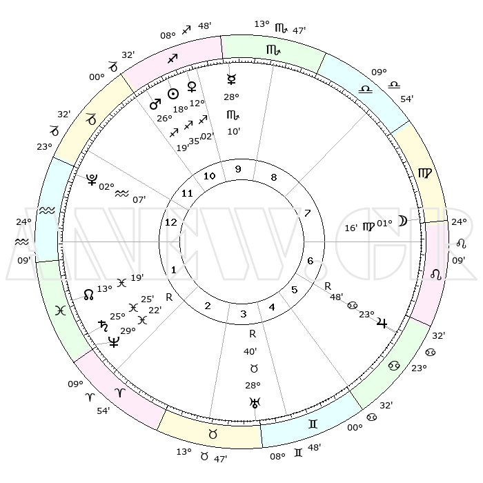 | | ΘΕΣΕΙΣ ΠΛΑΝΗΤΩΝ ΑΣΤΡΟΛΟΓΙΚΟΥ ΧΑΡΤΗ ΤΗΣ ΣΤΙΓΜΗΣ ΑΥΤΗΣ | | | | Πλανήτης | Ζώδιο | Μοίρες | Δεκαήμ. | Σε οίκο | Απόκλιση | | Ακμές των οίκων | | Ηλιος | Τοξότης | 18°33' | Δεύτερο | 10 | 22 S 56 | | 1ος | 08°32' | Υδροχόος | | Σελήνη | Παρθένος | 00°51' | Πρώτο | 7 | 12 N 10 | | 2ος | 23°46' | Ιχθείς | | Ερμής | Σκορπιός | 28°08' | Τρίτο | 10 | 17 S 42 | | 3ος | 00°44' | Ταύρος | | Αφροδίτη | Τοξότης | 11°60' | Δεύτερο | 10 | 21 S 53 | | 4ος | 27°49' | Ταύρος | | Αρης | Τοξότης | 26°17' | Τρίτο | 11 | 24 S 07 | | 5ος | 20°03' | Δίδυμοι | | Δίας | Καρκίνος | 23°49'R | Τρίτο | 6 | 21 N 31 | | 6ος | 11°52' | Καρκίνος | | Κρόνος | Ιχθείς | 25°25' | Τρίτο | 2 | 03 S 58 | | 7ος | 08°32' | Λέων | | Ουρανός | Ταύρος | 28°40'R | Τρίτο | 4 | 19 N 40 | | 8ος | 23°46' | Παρθένος | | Ποσειδώνας | Ιχθείς | 29°22'R | Τρίτο | 2 | 01 S 29 | | 9ος | 00°44' | Σκορπιός | | Πλούτωνας | Υδροχόος | 02°07' | Πρώτο | 12 | 23 S 21 | | 10ος | 27°49' | Σκορπιός | | Β. Δεσμός | Ιχθείς | 13°19' | Δεύτερο | 1 | 06 S 33 | | 11ος | 20°03' | Τοξότης | | Ωροσκόπος | Υδροχόος | 08°32' | Πρώτο | | | 12ος | 11°52' | Αιγόκερως | | Μεσουράνημα | Σκορπιός | 27°49' | Τρίτο | | | |