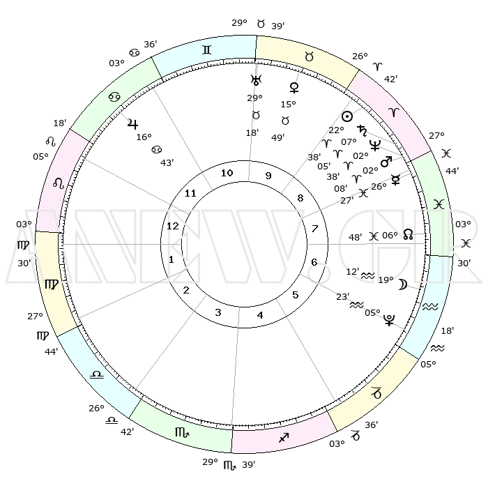 | | ΘΕΣΕΙΣ ΠΛΑΝΗΤΩΝ ΑΣΤΡΟΛΟΓΙΚΟΥ ΧΑΡΤΗ ΤΗΣ ΣΤΙΓΜΗΣ ΑΥΤΗΣ | | | | Πλανήτης | Ζώδιο | Μοίρες | Δεκαήμ. | Σε οίκο | Απόκλιση | | Ακμές των οίκων | | Ηλιος | Κριός | 22°18' | Τρίτο | 12 | 08 N 41 | | 1ος | 03°57' | Ταύρος | | Σελήνη | Υδροχόος | 14°47' | Δεύτερο | 11 | 18 S 21 | | 2ος | 05°05' | Δίδυμοι | | Ερμής | Ιχθείς | 25°60' | Τρίτο | 12 | 03 S 52 | | 3ος | 28°15' | Δίδυμοι | | Αφροδίτη | Ταύρος | 15°23' | Δεύτερο | 1 | 16 N 29 | | 4ος | 19°58' | Καρκίνος | | Αρης | Κριός | 01°51' | Πρώτο | 12 | 00 S 11 | | 5ος | 14°47' | Λέων | | Δίας | Καρκίνος | 16°41' | Δεύτερο | 3 | 22 N 46 | | 6ος | 18°17' | Παρθένος | | Κρόνος | Κριός | 07°03' | Πρώτο | 12 | 00 N 50 | | 7ος | 03°57' | Σκορπιός | | Ουρανός | Ταύρος | 29°17' | Τρίτο | 1 | 19 N 50 | | 8ος | 05°05' | Τοξότης | | Ποσειδώνας | Κριός | 02°37' | Πρώτο | 12 | 00 S 10 | | 9ος | 28°15' | Τοξότης | | Πλούτωνας | Υδροχόος | 05°22' | Πρώτο | 10 | 22 S 47 | | 10ος | 19°58' | Αιγόκερως | | Β. Δεσμός | Ιχθείς | 06°49' | Πρώτο | 11 | 09 S 01 | | 11ος | 14°47' | Υδροχόος | | Ωροσκόπος | Ταύρος | 03°57' | Πρώτο | | | 12ος | 18°17' | Ιχθείς | | Μεσουράνημα | Αιγόκερως | 19°58' | Δεύτερο | | | |