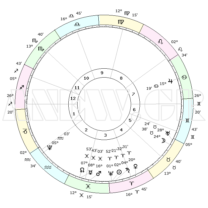 | | ΘΕΣΕΙΣ ΠΛΑΝΗΤΩΝ ΑΣΤΡΟΛΟΓΙΚΟΥ ΧΑΡΤΗ ΤΗΣ ΣΤΙΓΜΗΣ ΑΥΤΗΣ | | | | Πλανήτης | Ζώδιο | Μοίρες | Δεκαήμ. | Σε οίκο | Απόκλιση | | Ακμές των οίκων | | Ηλιος | Κριός | 02°17' | Πρώτο | 4 | 00 N 55 | | 1ος | 06°14' | Τοξότης | | Σελήνη | Ταύρος | 23°41' | Τρίτο | 6 | 23 N 35 | | 2ος | 08°19' | Αιγόκερως | | Ερμής | Ιχθείς | 08°42' | Πρώτο | 3 | 07 S 51 | | 3ος | 15°04' | Υδροχόος | | Αφροδίτη | Κριός | 20°26' | Τρίτο | 4 | 07 N 15 | | 4ος | 21°09' | Ιχθείς | | Αρης | Ιχθείς | 16°00' | Δεύτερο | 3 | 06 S 30 | | 5ος | 21°20' | Κριός | | Δίας | Καρκίνος | 15°19' | Δεύτερο | 8 | 22 N 55 | | 6ος | 15°33' | Ταύρος | | Κρόνος | Κριός | 04°32' | Πρώτο | 4 | 00 S 09 | | 7ος | 06°14' | Δίδυμοι | | Ουρανός | Ταύρος | 28°24' | Τρίτο | 6 | 19 N 38 | | 8ος | 08°19' | Καρκίνος | | Ποσειδώνας | Κριός | 01°52' | Πρώτο | 4 | 00 S 27 | | 9ος | 15°04' | Λέων | | Πλούτωνας | Υδροχόος | 05°03' | Πρώτο | 2 | 22 S 48 | | 10ος | 21°09' | Παρθένος | | Β. Δεσμός | Ιχθείς | 07°53' | Πρώτο | 3 | 08 S 37 | | 11ος | 21°20' | Ζυγός | | Ωροσκόπος | Τοξότης | 06°14' | Πρώτο | | | 12ος | 15°33' | Σκορπιός | | Μεσουράνημα | Παρθένος | 21°09' | Τρίτο | | | |