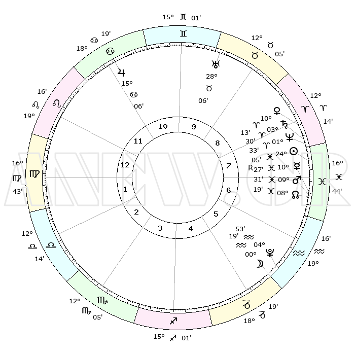 | | ΘΕΣΕΙΣ ΠΛΑΝΗΤΩΝ ΑΣΤΡΟΛΟΓΙΚΟΥ ΧΑΡΤΗ ΤΗΣ ΣΤΙΓΜΗΣ ΑΥΤΗΣ | | | | Πλανήτης | Ζώδιο | Μοίρες | Δεκαήμ. | Σε οίκο | Απόκλιση | | Ακμές των οίκων | | Ηλιος | Ιχθείς | 24°01' | Τρίτο | 8 | 02 S 22 | | 1ος | 29°40' | Λέων | | Σελήνη | Αιγόκερως | 29°35' | Τρίτο | 5 | 23 S 30 | | 2ος | 23°29' | Παρθένος | | Ερμής | Ιχθείς | 10°29'R | Δεύτερο | 7 | 05 S 19 | | 3ος | 22°07' | Ζυγός | | Αφροδίτη | Κριός | 10°09' | Δεύτερο | 8 | 03 N 03 | | 4ος | 25°02' | Σκορπιός | | Αρης | Ιχθείς | 09°28' | Πρώτο | 7 | 09 S 01 | | 5ος | 29°15' | Τοξότης | | Δίας | Καρκίνος | 15°06' | Δεύτερο | 11 | 22 N 56 | | 6ος | 01°14' | Υδροχόος | | Κρόνος | Κριός | 03°30' | Πρώτο | 8 | 00 S 34 | | 7ος | 29°40' | Υδροχόος | | Ουρανός | Ταύρος | 28°06' | Τρίτο | 10 | 19 N 34 | | 8ος | 23°29' | Ιχθείς | | Ποσειδώνας | Κριός | 01°33' | Πρώτο | 8 | 00 S 35 | | 9ος | 22°07' | Κριός | | Πλούτωνας | Υδροχόος | 04°53' | Πρώτο | 6 | 22 S 50 | | 10ος | 25°02' | Ταύρος | | Β. Δεσμός | Ιχθείς | 08°19' | Πρώτο | 7 | 08 S 27 | | 11ος | 29°15' | Δίδυμοι | | Ωροσκόπος | Λέων | 29°40' | Τρίτο | | | 12ος | 01°14' | Λέων | | Μεσουράνημα | Ταύρος | 25°02' | Τρίτο | | | |