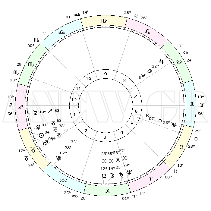 | | ΘΕΣΕΙΣ ΠΛΑΝΗΤΩΝ ΑΣΤΡΟΛΟΓΙΚΟΥ ΧΑΡΤΗ ΤΗΣ ΣΤΙΓΜΗΣ ΑΥΤΗΣ | | | | Πλανήτης | Ζώδιο | Μοίρες | Δεκαήμ. | Σε οίκο | Απόκλιση | | Ακμές των οίκων | | Ηλιος | Αιγόκερως | 04°28' | Πρώτο | 3 | 23 S 21 | | 1ος | 24°48' | Ζυγός | | Σελήνη | Ιχθείς | 12°23' | Δεύτερο | 5 | 06 S 49 | | 2ος | 22°55' | Σκορπιός | | Ερμής | Τοξότης | 19°38' | Δεύτερο | 2 | 22 S 54 | | 3ος | 24°30' | Τοξότης | | Αφροδίτη | Αιγόκερως | 01°41' | Πρώτο | 3 | 23 S 42 | | 4ος | 28°21' | Αιγόκερως | | Αρης | Αιγόκερως | 08°07' | Πρώτο | 3 | 24 S 02 | | 5ος | 01°18' | Ιχθείς | | Δίας | Καρκίνος | 22°07'R | Τρίτο | 9 | 21 N 50 | | 6ος | 00°25' | Κριός | | Κρόνος | Ιχθείς | 25°58' | Τρίτο | 5 | 03 S 42 | | 7ος | 24°48' | Κριός | | Ουρανός | Ταύρος | 28°07'R | Τρίτο | 8 | 19 N 32 | | 8ος | 22°55' | Ταύρος | | Ποσειδώνας | Ιχθείς | 29°27' | Τρίτο | 5 | 01 S 27 | | 9ος | 24°30' | Δίδυμοι | | Πλούτωνας | Υδροχόος | 02°33' | Πρώτο | 4 | 23 S 15 | | 10ος | 28°21' | Καρκίνος | | Β. Δεσμός | Ιχθείς | 12°29' | Δεύτερο | 5 | 06 S 52 | | 11ος | 01°18' | Παρθένος | | Ωροσκόπος | Ζυγός | 24°48' | Τρίτο | | | 12ος | 00°25' | Ζυγός | | Μεσουράνημα | Καρκίνος | 28°21' | Τρίτο | | | |