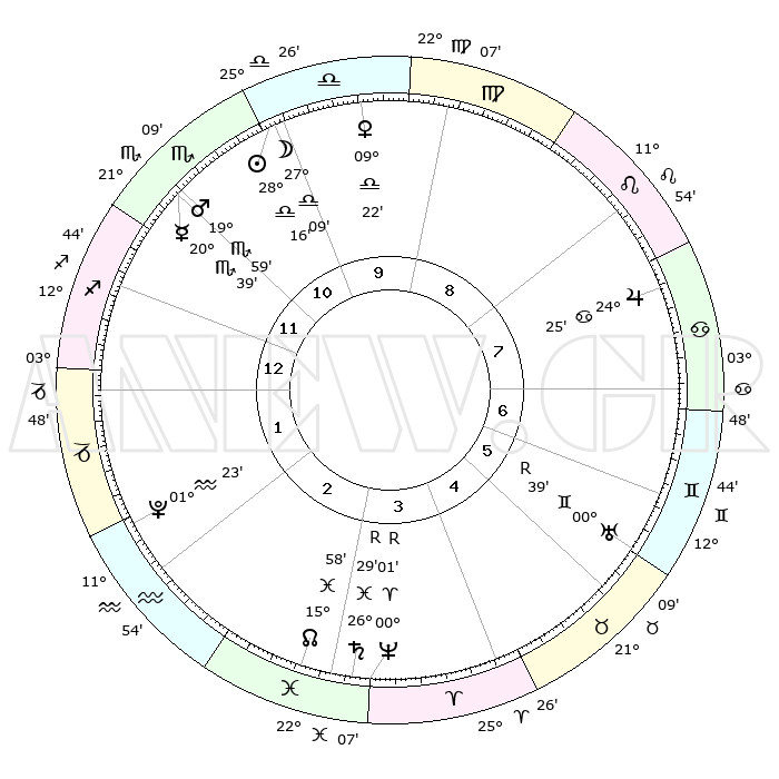 | ΘΕΣΕΙΣ ΠΛΑΝΗΤΩΝ ΑΣΤΡΟΛΟΓΙΚΟΥ ΧΑΡΤΗ ΤΗΣ ΣΤΙΓΜΗΣ ΑΥΤΗΣ | | Πλανήτης | Ζώδιο | Μοίρες | Δεκαήμ. | Σε οίκο | Απόκλιση | | Ακμές των οίκων | Ηλιος | Ζυγός | 27°54' | Τρίτο | 2 | 10 S 44 | | 1ος | 17°19' | Παρθένος | Σελήνη | Ζυγός | 22°52' | Τρίτο | 2 | 11 S 39 | | 2ος | 12°53' | Ζυγός | Ερμής | Σκορπιός | 20°12' | Τρίτο | 3 | 20 S 01 | | 3ος | 12°45' | Σκορπιός | Αφροδίτη | Ζυγός | 08°56' | Πρώτο | 1 | 02 S 08 | | 4ος | 15°41' | Τοξότης | Αρης | Σκορπιός | 19°44' | Δεύτερο | 3 | 17 S 56 | | 5ος | 18°58' | Αιγόκερως | Δίας | Καρκίνος | 24°24' | Τρίτο | 11 | 21 N 18 | | 6ος | 19°54' | Υδροχόος | Κρόνος | Ιχθείς | 26°30'R | Τρίτο | 7 | 03 S 41 | | 7ος | 17°19' | Ιχθείς | Ουρανός | Δίδυμοι | 00°40'R | Πρώτο | 9 | 20 N 05 | | 8ος | 12°53' | Κριός | Ποσειδώνας | Κριός | 00°02'R | Πρώτο | 7 | 01 S 15 | | 9ος | 12°45' | Ταύρος | Πλούτωνας | Υδροχόος | 01°23' | Πρώτο | 5 | 23 S 32 | | 10ος | 15°41' | Δίδυμοι | Β. Δεσμός | Ιχθείς | 15°59' | Δεύτερο | 6 | 05 S 32 | | 11ος | 18°58' | Καρκίνος | Ωροσκόπος | Παρθένος | 17°19' | Δεύτερο | | | 12ος | 19°54' | Λέων | Μεσουράνημα | Δίδυμοι | 15°41' | Δεύτερο | | | |