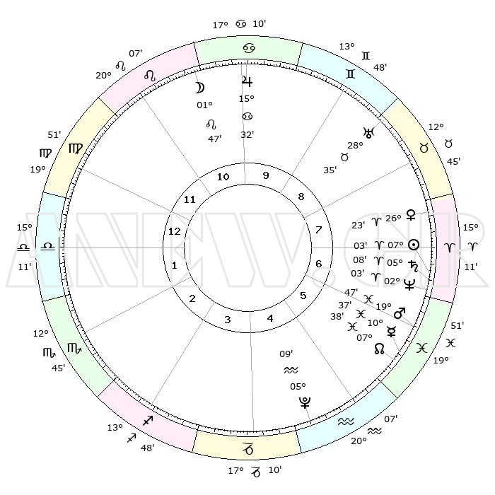 | | ΘΕΣΕΙΣ ΠΛΑΝΗΤΩΝ ΑΣΤΡΟΛΟΓΙΚΟΥ ΧΑΡΤΗ ΤΗΣ ΣΤΙΓΜΗΣ ΑΥΤΗΣ | | | | Πλανήτης | Ζώδιο | Μοίρες | Δεκαήμ. | Σε οίκο | Απόκλιση | | Ακμές των οίκων | | Ηλιος | Κριός | 06°59' | Πρώτο | 7 | 02 N 46 | | 1ος | 26°22' | Παρθένος | | Σελήνη | Λέων | 00°55' | Πρώτο | 11 | 23 N 05 | | 2ος | 22°41' | Ζυγός | | Ερμής | Ιχθείς | 10°35' | Δεύτερο | 6 | 08 S 06 | | 3ος | 22°58' | Σκορπιός | | Αφροδίτη | Κριός | 26°18' | Τρίτο | 8 | 09 N 34 | | 4ος | 25°55' | Τοξότης | | Αρης | Ιχθείς | 19°44' | Δεύτερο | 6 | 05 S 02 | | 5ος | 28°57' | Αιγόκερως | | Δίας | Καρκίνος | 15°32' | Δεύτερο | 10 | 22 N 54 | | 6ος | 29°31' | Υδροχόος | | Κρόνος | Κριός | 05°07' | Πρώτο | 7 | 00 N 05 | | 7ος | 26°22' | Ιχθείς | | Ουρανός | Ταύρος | 28°35' | Τρίτο | 9 | 19 N 40 | | 8ος | 22°41' | Κριός | | Ποσειδώνας | Κριός | 02°03' | Πρώτο | 7 | 00 S 23 | | 9ος | 22°58' | Ταύρος | | Πλούτωνας | Υδροχόος | 05°09' | Πρώτο | 5 | 22 S 48 | | 10ος | 25°55' | Δίδυμοι | | Β. Δεσμός | Ιχθείς | 07°38' | Πρώτο | 6 | 08 S 42 | | 11ος | 28°57' | Καρκίνος | | Ωροσκόπος | Παρθένος | 26°22' | Τρίτο | | | 12ος | 29°31' | Λέων | | Μεσουράνημα | Δίδυμοι | 25°55' | Τρίτο | | | |
