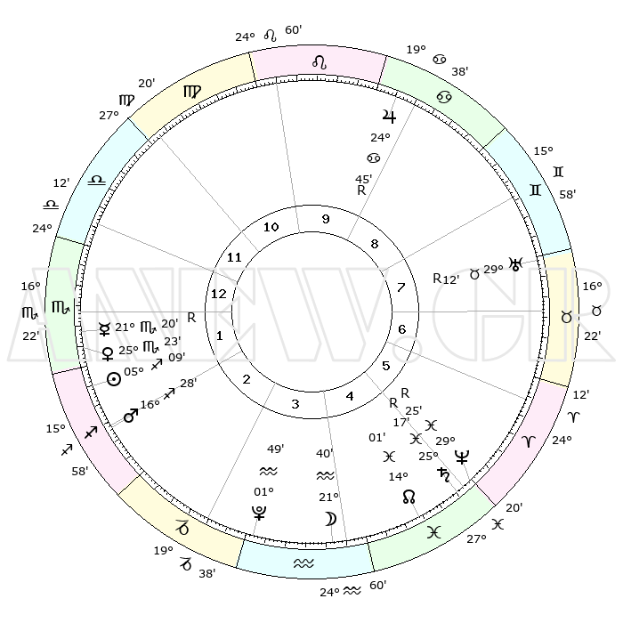 | | ΘΕΣΕΙΣ ΠΛΑΝΗΤΩΝ ΑΣΤΡΟΛΟΓΙΚΟΥ ΧΑΡΤΗ ΤΗΣ ΣΤΙΓΜΗΣ ΑΥΤΗΣ | | | | Πλανήτης | Ζώδιο | Μοίρες | Δεκαήμ. | Σε οίκο | Απόκλιση | | Ακμές των οίκων | | Ηλιος | Τοξότης | 05°06' | Πρώτο | 2 | 21 S 09 | | 1ος | 03°30' | Σκορπιός | | Σελήνη | Υδροχόος | 21°06' | Τρίτο | 4 | 16 S 21 | | 2ος | 02°08' | Τοξότης | | Ερμής | Σκορπιός | 21°21'R | Τρίτο | 1 | 15 S 54 | | 3ος | 04°22' | Αιγόκερως | | Αφροδίτη | Σκορπιός | 25°20' | Τρίτο | 1 | 18 S 16 | | 4ος | 08°49' | Υδροχόος | | Αρης | Τοξότης | 16°26' | Δεύτερο | 2 | 23 S 22 | | 5ος | 11°40' | Ιχθείς | | Δίας | Καρκίνος | 24°45'R | Τρίτο | 9 | 21 N 19 | | 6ος | 10°01' | Κριός | | Κρόνος | Ιχθείς | 25°17'R | Τρίτο | 5 | 04 S 04 | | 7ος | 03°30' | Ταύρος | | Ουρανός | Ταύρος | 29°12'R | Τρίτο | 7 | 19 N 46 | | 8ος | 02°08' | Δίδυμοι | | Ποσειδώνας | Ιχθείς | 29°25'R | Τρίτο | 5 | 01 S 28 | | 9ος | 04°22' | Καρκίνος | | Πλούτωνας | Υδροχόος | 01°49' | Πρώτο | 3 | 23 S 25 | | 10ος | 08°49' | Λέων | | Β. Δεσμός | Ιχθείς | 14°01' | Δεύτερο | 5 | 06 S 17 | | 11ος | 11°40' | Παρθένος | | Ωροσκόπος | Σκορπιός | 03°30' | Πρώτο | | | 12ος | 10°01' | Ζυγός | | Μεσουράνημα | Λέων | 08°49' | Πρώτο | | | |