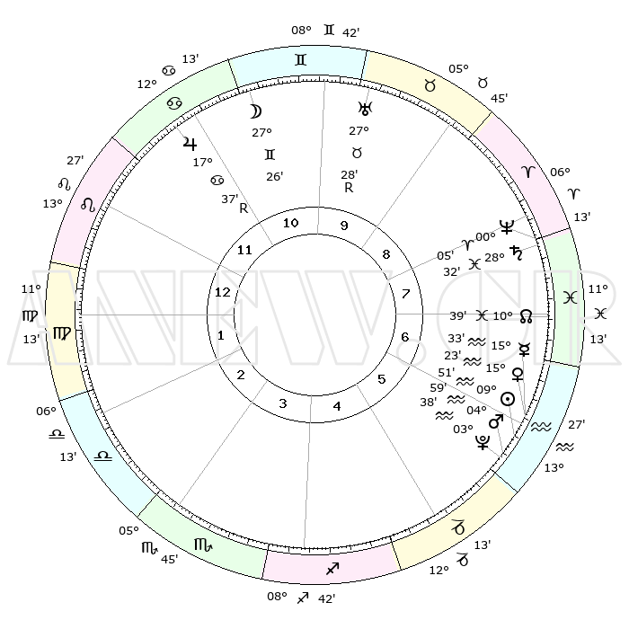 | | ΘΕΣΕΙΣ ΠΛΑΝΗΤΩΝ ΑΣΤΡΟΛΟΓΙΚΟΥ ΧΑΡΤΗ ΤΗΣ ΣΤΙΓΜΗΣ ΑΥΤΗΣ | | | | Πλανήτης | Ζώδιο | Μοίρες | Δεκαήμ. | Σε οίκο | Απόκλιση | | Ακμές των οίκων | | Ηλιος | Υδροχόος | 09°47' | Πρώτο | 6 | 17 S 48 | | 1ος | 21°12' | Λέων | | Σελήνη | Δίδυμοι | 26°26' | Τρίτο | 11 | 28 N 21 | | 2ος | 14°07' | Παρθένος | | Ερμής | Υδροχόος | 15°26' | Δεύτερο | 6 | 18 S 07 | | 3ος | 11°54' | Ζυγός | | Αφροδίτη | Υδροχόος | 15°18' | Δεύτερο | 6 | 17 S 31 | | 4ος | 14°37' | Σκορπιός | | Αρης | Υδροχόος | 04°56' | Πρώτο | 6 | 20 S 02 | | 5ος | 19°26' | Τοξότης | | Δίας | Καρκίνος | 17°37'R | Δεύτερο | 11 | 22 N 34 | | 6ος | 22°12' | Αιγόκερως | | Κρόνος | Ιχθείς | 28°32' | Τρίτο | 8 | 02 S 35 | | 7ος | 21°12' | Υδροχόος | | Ουρανός | Ταύρος | 27°28'R | Τρίτο | 10 | 19 N 24 | | 8ος | 14°07' | Ιχθείς | | Ποσειδώνας | Κριός | 00°05' | Πρώτο | 8 | 01 S 11 | | 9ος | 11°54' | Κριός | | Πλούτωνας | Υδροχόος | 03°38' | Πρώτο | 6 | 23 S 02 | | 10ος | 14°37' | Ταύρος | | Β. Δεσμός | Ιχθείς | 10°39' | Δεύτερο | 7 | 07 S 34 | | 11ος | 19°26' | Δίδυμοι | | Ωροσκόπος | Λέων | 21°12' | Τρίτο | | | 12ος | 22°12' | Καρκίνος | | Μεσουράνημα | Ταύρος | 14°37' | Δεύτερο | | | |