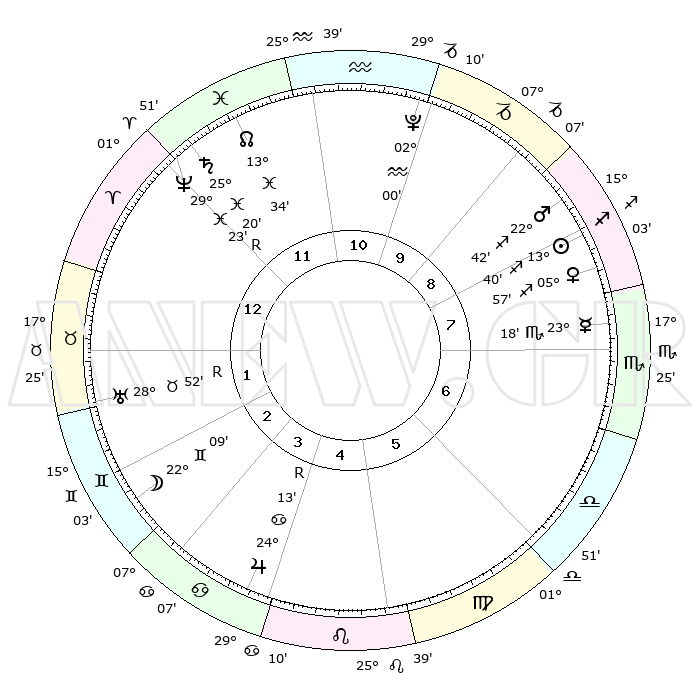 | | ΘΕΣΕΙΣ ΠΛΑΝΗΤΩΝ ΑΣΤΡΟΛΟΓΙΚΟΥ ΧΑΡΤΗ ΤΗΣ ΣΤΙΓΜΗΣ ΑΥΤΗΣ | | | | Πλανήτης | Ζώδιο | Μοίρες | Δεκαήμ. | Σε οίκο | Απόκλιση | | Ακμές των οίκων | | Ηλιος | Τοξότης | 13°38' | Δεύτερο | 8 | 22 S 26 | | 1ος | 27°54' | Κριός | | Σελήνη | Δίδυμοι | 21°34' | Τρίτο | 2 | 28 N 06 | | 2ος | 00°42' | Δίδυμοι | | Ερμής | Σκορπιός | 23°16' | Τρίτο | 7 | 16 S 10 | | 3ος | 24°29' | Δίδυμοι | | Αφροδίτη | Τοξότης | 05°54' | Πρώτο | 8 | 20 S 45 | | 4ος | 16°10' | Καρκίνος | | Αρης | Τοξότης | 22°40' | Τρίτο | 8 | 23 S 56 | | 5ος | 10°21' | Λέων | | Δίας | Καρκίνος | 24°13'R | Τρίτο | 4 | 21 N 26 | | 6ος | 12°40' | Παρθένος | | Κρόνος | Ιχθείς | 25°20' | Τρίτο | 12 | 04 S 01 | | 7ος | 27°54' | Ζυγός | | Ουρανός | Ταύρος | 28°52'R | Τρίτο | 1 | 19 N 42 | | 8ος | 00°42' | Τοξότης | | Ποσειδώνας | Ιχθείς | 29°23'R | Τρίτο | 12 | 01 S 29 | | 9ος | 24°29' | Τοξότης | | Πλούτωνας | Υδροχόος | 02°00' | Πρώτο | 10 | 23 S 23 | | 10ος | 16°10' | Αιγόκερως | | Β. Δεσμός | Ιχθείς | 13°34' | Δεύτερο | 12 | 06 S 27 | | 11ος | 10°21' | Υδροχόος | | Ωροσκόπος | Κριός | 27°54' | Τρίτο | | | 12ος | 12°40' | Ιχθείς | | Μεσουράνημα | Αιγόκερως | 16°10' | Δεύτερο | | | |