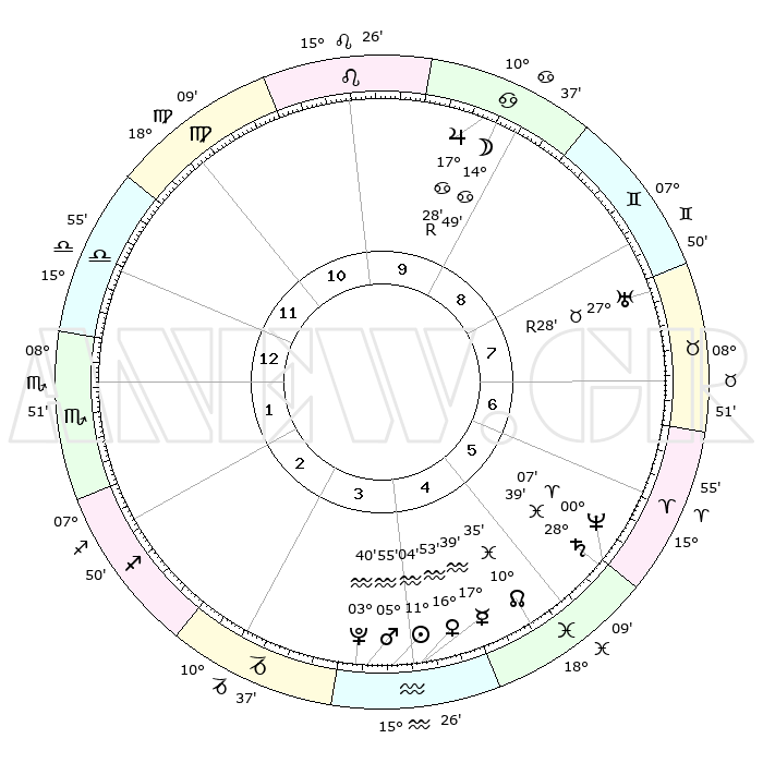 | | ΘΕΣΕΙΣ ΠΛΑΝΗΤΩΝ ΑΣΤΡΟΛΟΓΙΚΟΥ ΧΑΡΤΗ ΤΗΣ ΣΤΙΓΜΗΣ ΑΥΤΗΣ | | | | Πλανήτης | Ζώδιο | Μοίρες | Δεκαήμ. | Σε οίκο | Απόκλιση | | Ακμές των οίκων | | Ηλιος | Υδροχόος | 10°59' | Δεύτερο | 4 | 17 S 28 | | 1ος | 14°20' | Ζυγός | | Σελήνη | Καρκίνος | 13°36' | Δεύτερο | 9 | 27 N 01 | | 2ος | 11°51' | Σκορπιός | | Ερμής | Υδροχόος | 17°30' | Δεύτερο | 4 | 17 S 26 | | 3ος | 12°52' | Τοξότης | | Αφροδίτη | Υδροχόος | 16°46' | Δεύτερο | 4 | 17 S 05 | | 4ος | 16°12' | Αιγόκερως | | Αρης | Υδροχόος | 05°51' | Πρώτο | 4 | 19 S 49 | | 5ος | 19°08' | Υδροχόος | | Δίας | Καρκίνος | 17°29'R | Δεύτερο | 10 | 22 N 35 | | 6ος | 18°56' | Ιχθείς | | Κρόνος | Ιχθείς | 28°39' | Τρίτο | 6 | 02 S 32 | | 7ος | 14°20' | Κριός | | Ουρανός | Ταύρος | 27°28'R | Τρίτο | 8 | 19 N 24 | | 8ος | 11°51' | Ταύρος | | Ποσειδώνας | Κριός | 00°07' | Πρώτο | 6 | 01 S 10 | | 9ος | 12°52' | Δίδυμοι | | Πλούτωνας | Υδροχόος | 03°40' | Πρώτο | 4 | 23 S 02 | | 10ος | 16°12' | Καρκίνος | | Β. Δεσμός | Ιχθείς | 10°35' | Δεύτερο | 5 | 07 S 36 | | 11ος | 19°08' | Λέων | | Ωροσκόπος | Ζυγός | 14°20' | Δεύτερο | | | 12ος | 18°56' | Παρθένος | | Μεσουράνημα | Καρκίνος | 16°12' | Δεύτερο | | | |
