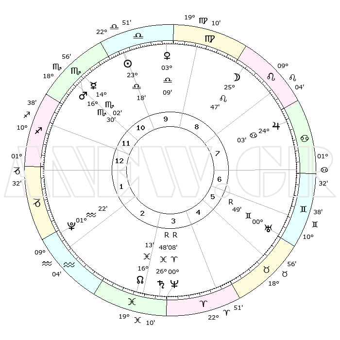 | ΘΕΣΕΙΣ ΠΛΑΝΗΤΩΝ ΑΣΤΡΟΛΟΓΙΚΟΥ ΧΑΡΤΗ ΤΗΣ ΣΤΙΓΜΗΣ ΑΥΤΗΣ | | Πλανήτης | Ζώδιο | Μοίρες | Δεκαήμ. | Σε οίκο | Απόκλιση | | Ακμές των οίκων | Ηλιος | Ζυγός | 23°09' | Τρίτο | 12 | 09 S 00 | | 1ος | 12°44' | Σκορπιός | Σελήνη | Λέων | 23°43' | Τρίτο | 10 | 15 N 38 | | 2ος | 12°01' | Τοξότης | Ερμής | Σκορπιός | 13°49' | Δεύτερο | 1 | 17 S 45 | | 3ος | 15°13' | Αιγόκερως | Αφροδίτη | Ζυγός | 02°57' | Πρώτο | 11 | 00 N 13 | | 4ος | 20°20' | Υδροχόος | Αρης | Σκορπιός | 16°23' | Δεύτερο | 1 | 16 S 58 | | 5ος | 22°53' | Ιχθείς | Δίας | Καρκίνος | 24°02' | Τρίτο | 9 | 21 N 21 | | 6ος | 20°12' | Κριός | Κρόνος | Ιχθείς | 26°48'R | Τρίτο | 5 | 03 S 34 | | 7ος | 12°44' | Ταύρος | Ουρανός | Δίδυμοι | 00°49'R | Πρώτο | 7 | 20 N 07 | | 8ος | 12°01' | Δίδυμοι | Ποσειδώνας | Κριός | 00°09'R | Πρώτο | 5 | 01 S 12 | | 9ος | 15°13' | Καρκίνος | Πλούτωνας | Υδροχόος | 01°22' | Πρώτο | 3 | 23 S 32 | | 10ος | 20°20' | Λέων | Β. Δεσμός | Ιχθείς | 16°14' | Δεύτερο | 4 | 05 S 26 | | 11ος | 22°53' | Παρθένος | Ωροσκόπος | Σκορπιός | 12°44' | Δεύτερο | | | 12ος | 20°12' | Ζυγός | Μεσουράνημα | Λέων | 20°20' | Τρίτο | | | |