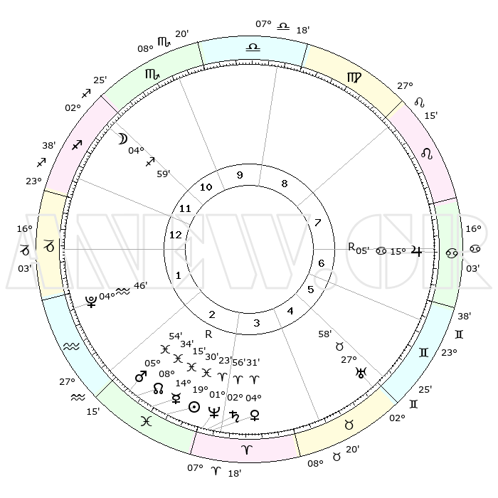 | | ΘΕΣΕΙΣ ΠΛΑΝΗΤΩΝ ΑΣΤΡΟΛΟΓΙΚΟΥ ΧΑΡΤΗ ΤΗΣ ΣΤΙΓΜΗΣ ΑΥΤΗΣ | | | | Πλανήτης | Ζώδιο | Μοίρες | Δεκαήμ. | Σε οίκο | Απόκλιση | | Ακμές των οίκων | | Ηλιος | Ιχθείς | 19°26' | Δεύτερο | 3 | 04 S 11 | | 1ος | 25°51' | Τοξότης | | Σελήνη | Τοξότης | 04°17' | Πρώτο | 11 | 26 S 10 | | 2ος | 01°59' | Υδροχόος | | Ερμής | Ιχθείς | 14°19'R | Δεύτερο | 3 | 03 S 03 | | 3ος | 11°37' | Ιχθείς | | Αφροδίτη | Κριός | 04°26' | Πρώτο | 3 | 00 N 41 | | 4ος | 16°11' | Κριός | | Αρης | Ιχθείς | 05°51' | Πρώτο | 2 | 10 S 23 | | 5ος | 13°10' | Ταύρος | | Δίας | Καρκίνος | 15°05'R | Δεύτερο | 7 | 22 N 56 | | 6ος | 05°16' | Δίδυμοι | | Κρόνος | Κριός | 02°56' | Πρώτο | 3 | 00 S 47 | | 7ος | 25°51' | Δίδυμοι | | Ουρανός | Ταύρος | 27°58' | Τρίτο | 5 | 19 N 32 | | 8ος | 01°59' | Λέων | | Ποσειδώνας | Κριός | 01°23' | Πρώτο | 3 | 00 S 39 | | 9ος | 11°37' | Παρθένος | | Πλούτωνας | Υδροχόος | 04°46' | Πρώτο | 2 | 22 S 50 | | 10ος | 16°11' | Ζυγός | | Β. Δεσμός | Ιχθείς | 08°34' | Πρώτο | 2 | 08 S 21 | | 11ος | 13°10' | Σκορπιός | | Ωροσκόπος | Τοξότης | 25°51' | Τρίτο | | | 12ος | 05°16' | Τοξότης | | Μεσουράνημα | Ζυγός | 16°11' | Δεύτερο | | | |