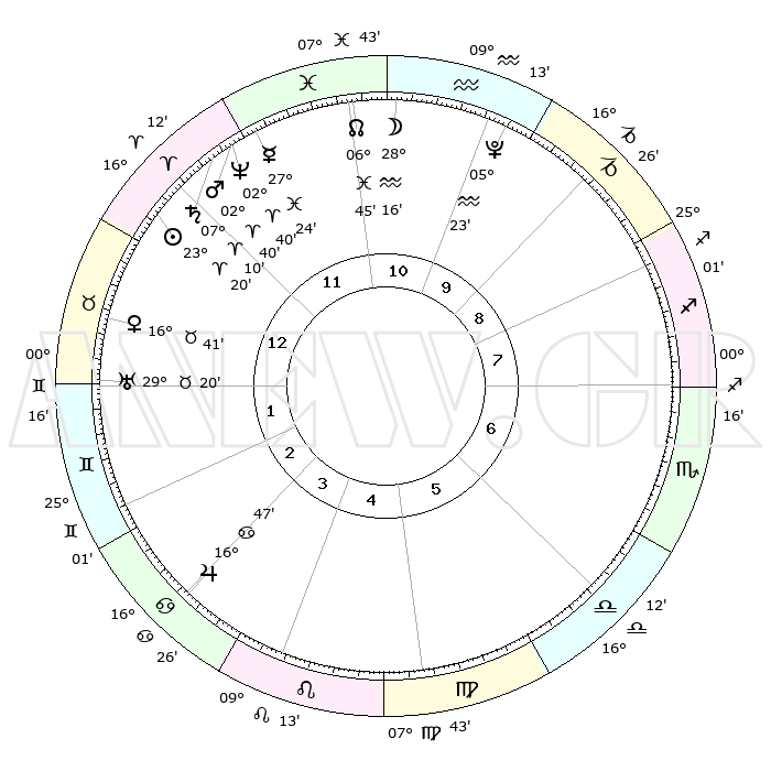 | | ΘΕΣΕΙΣ ΠΛΑΝΗΤΩΝ ΑΣΤΡΟΛΟΓΙΚΟΥ ΧΑΡΤΗ ΤΗΣ ΣΤΙΓΜΗΣ ΑΥΤΗΣ | | | | Πλανήτης | Ζώδιο | Μοίρες | Δεκαήμ. | Σε οίκο | Απόκλιση | | Ακμές των οίκων | | Ηλιος | Κριός | 23°15' | Τρίτο | 1 | 09 N 02 | | 1ος | 22°60' | Κριός | | Σελήνη | Υδροχόος | 27°17' | Τρίτο | 11 | 13 S 20 | | 2ος | 27°10' | Ταύρος | | Ερμής | Ιχθείς | 27°18' | Τρίτο | 12 | 03 S 24 | | 3ος | 21°29' | Δίδυμοι | | Αφροδίτη | Ταύρος | 16°35' | Δεύτερο | 1 | 16 N 52 | | 4ος | 13°11' | Καρκίνος | | Αρης | Κριός | 02°37' | Πρώτο | 12 | 00 N 08 | | 5ος | 06°56' | Λέων | | Δίας | Καρκίνος | 16°47' | Δεύτερο | 4 | 22 N 45 | | 6ος | 08°18' | Παρθένος | | Κρόνος | Κριός | 07°10' | Πρώτο | 12 | 00 N 52 | | 7ος | 22°60' | Ζυγός | | Ουρανός | Ταύρος | 29°20' | Τρίτο | 2 | 19 N 50 | | 8ος | 27°10' | Σκορπιός | | Ποσειδώνας | Κριός | 02°39' | Πρώτο | 12 | 00 S 09 | | 9ος | 21°29' | Τοξότης | | Πλούτωνας | Υδροχόος | 05°23' | Πρώτο | 10 | 22 S 47 | | 10ος | 13°11' | Αιγόκερως | | Β. Δεσμός | Ιχθείς | 06°46' | Πρώτο | 11 | 09 S 02 | | 11ος | 06°56' | Υδροχόος | | Ωροσκόπος | Κριός | 22°60' | Τρίτο | | | 12ος | 08°18' | Ιχθείς | | Μεσουράνημα | Αιγόκερως | 13°11' | Δεύτερο | | | |
