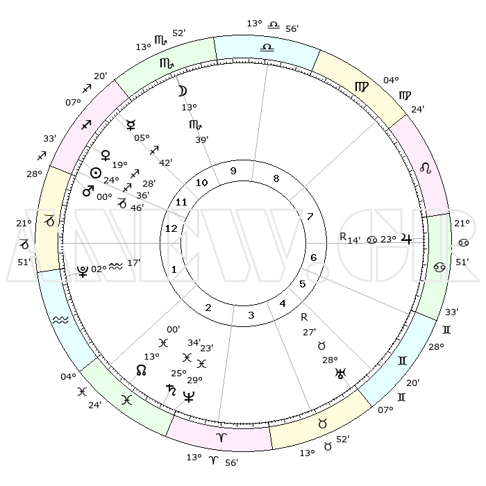 | | ΘΕΣΕΙΣ ΠΛΑΝΗΤΩΝ ΑΣΤΡΟΛΟΓΙΚΟΥ ΧΑΡΤΗ ΤΗΣ ΣΤΙΓΜΗΣ ΑΥΤΗΣ | | | | Πλανήτης | Ζώδιο | Μοίρες | Δεκαήμ. | Σε οίκο | Απόκλιση | | Ακμές των οίκων | | Ηλιος | Τοξότης | 24°21' | Τρίτο | 2 | 23 S 19 | | 1ος | 07°16' | Σκορπιός | | Σελήνη | Σκορπιός | 10°51' | Δεύτερο | 1 | 19 S 07 | | 2ος | 06°09' | Τοξότης | | Ερμής | Τοξότης | 05°23' | Πρώτο | 1 | 19 S 49 | | 3ος | 08°45' | Αιγόκερως | | Αφροδίτη | Τοξότης | 19°11' | Δεύτερο | 2 | 22 S 52 | | 4ος | 13°28' | Υδροχόος | | Αρης | Αιγόκερως | 00°35' | Πρώτο | 2 | 24 S 13 | | 5ος | 16°14' | Ιχθείς | | Δίας | Καρκίνος | 23°15'R | Τρίτο | 9 | 21 N 38 | | 6ος | 14°11' | Κριός | | Κρόνος | Ιχθείς | 25°34' | Τρίτο | 5 | 03 S 53 | | 7ος | 07°16' | Ταύρος | | Ουρανός | Ταύρος | 28°27'R | Τρίτο | 7 | 19 N 37 | | 8ος | 06°09' | Δίδυμοι | | Ποσειδώνας | Ιχθείς | 29°23' | Τρίτο | 5 | 01 S 29 | | 9ος | 08°45' | Καρκίνος | | Πλούτωνας | Υδροχόος | 02°16' | Πρώτο | 3 | 23 S 19 | | 10ος | 13°28' | Λέων | | Β. Δεσμός | Ιχθείς | 13°01' | Δεύτερο | 4 | 06 S 40 | | 11ος | 16°14' | Παρθένος | | Ωροσκόπος | Σκορπιός | 07°16' | Πρώτο | | | 12ος | 14°11' | Ζυγός | | Μεσουράνημα | Λέων | 13°28' | Δεύτερο | | | |