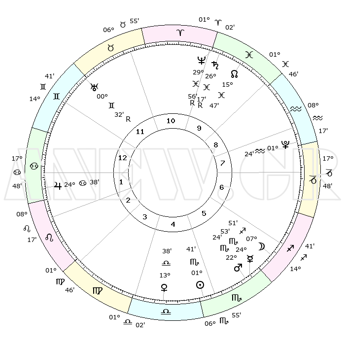 | | ΘΕΣΕΙΣ ΠΛΑΝΗΤΩΝ ΑΣΤΡΟΛΟΓΙΚΟΥ ΧΑΡΤΗ ΤΗΣ ΣΤΙΓΜΗΣ ΑΥΤΗΣ | | | | Πλανήτης | Ζώδιο | Μοίρες | Δεκαήμ. | Σε οίκο | Απόκλιση | | Ακμές των οίκων | | Ηλιος | Σκορπιός | 01°11' | Πρώτο | 11 | 11 S 53 | | 1ος | 12°44' | Τοξότης | | Σελήνη | Τοξότης | 01°54' | Πρώτο | 12 | 25 S 23 | | 2ος | 15°58' | Αιγόκερως | | Ερμής | Σκορπιός | 24°17' | Τρίτο | 12 | 21 S 20 | | 3ος | 23°49' | Υδροχόος | | Αφροδίτη | Ζυγός | 13°01' | Δεύτερο | 10 | 03 S 44 | | 4ος | 29°40' | Ιχθείς | | Αρης | Σκορπιός | 22°03' | Τρίτο | 11 | 18 S 35 | | 5ος | 28°51' | Κριός | | Δίας | Καρκίνος | 24°36' | Τρίτο | 8 | 21 N 16 | | 6ος | 22°16' | Ταύρος | | Κρόνος | Ιχθείς | 26°19'R | Τρίτο | 3 | 03 S 45 | | 7ος | 12°44' | Δίδυμοι | | Ουρανός | Δίδυμοι | 00°33'R | Πρώτο | 6 | 20 N 03 | | 8ος | 15°58' | Καρκίνος | | Ποσειδώνας | Ιχθείς | 29°57'R | Τρίτο | 4 | 01 S 17 | | 9ος | 23°49' | Λέων | | Πλούτωνας | Υδροχόος | 01°24' | Πρώτο | 2 | 23 S 32 | | 10ος | 29°40' | Παρθένος | | Β. Δεσμός | Ιχθείς | 15°48' | Δεύτερο | 3 | 05 S 36 | | 11ος | 28°51' | Ζυγός | | Ωροσκόπος | Τοξότης | 12°44' | Δεύτερο | | | 12ος | 22°16' | Σκορπιός | | Μεσουράνημα | Παρθένος | 29°40' | Τρίτο | | | |