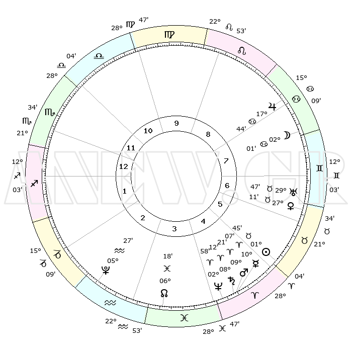 | | ΘΕΣΕΙΣ ΠΛΑΝΗΤΩΝ ΑΣΤΡΟΛΟΓΙΚΟΥ ΧΑΡΤΗ ΤΗΣ ΣΤΙΓΜΗΣ ΑΥΤΗΣ | | | | Πλανήτης | Ζώδιο | Μοίρες | Δεκαήμ. | Σε οίκο | Απόκλιση | | Ακμές των οίκων | | Ηλιος | Ταύρος | 01°41' | Πρώτο | 6 | 12 N 03 | | 1ος | 21°49' | Σκορπιός | | Σελήνη | Καρκίνος | 01°01' | Πρώτο | 8 | 28 N 06 | | 2ος | 21°57' | Τοξότης | | Ερμής | Κριός | 10°00' | Δεύτερο | 5 | 01 N 35 | | 3ος | 26°22' | Αιγόκερως | | Αφροδίτη | Ταύρος | 27°06' | Τρίτο | 7 | 19 N 59 | | 4ος | 02°04' | Ιχθείς | | Αρης | Κριός | 09°17' | Πρώτο | 5 | 02 N 49 | | 5ος | 03°59' | Κριός | | Δίας | Καρκίνος | 17°43' | Δεύτερο | 8 | 22 N 38 | | 6ος | 00°08' | Ταύρος | | Κρόνος | Κριός | 08°12' | Πρώτο | 5 | 01 N 16 | | 7ος | 21°49' | Ταύρος | | Ουρανός | Ταύρος | 29°46' | Τρίτο | 7 | 19 N 56 | | 8ος | 21°57' | Δίδυμοι | | Ποσειδώνας | Κριός | 02°58' | Πρώτο | 4 | 00 S 02 | | 9ος | 26°22' | Καρκίνος | | Πλούτωνας | Υδροχόος | 05°27' | Πρώτο | 3 | 22 S 48 | | 10ος | 02°04' | Παρθένος | | Β. Δεσμός | Ιχθείς | 06°18' | Πρώτο | 4 | 09 S 12 | | 11ος | 03°59' | Ζυγός | | Ωροσκόπος | Σκορπιός | 21°49' | Τρίτο | | | 12ος | 00°08' | Σκορπιός | | Μεσουράνημα | Παρθένος | 02°04' | Πρώτο | | | |