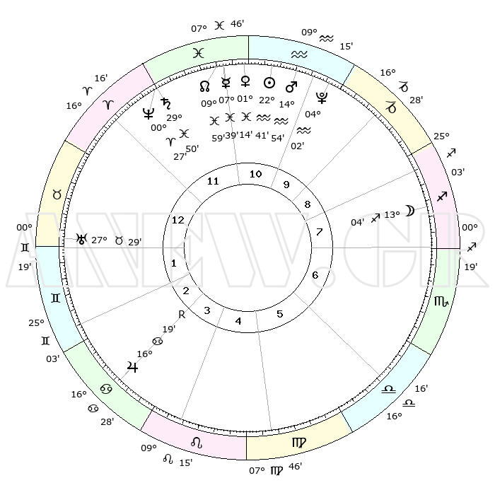 | | ΘΕΣΕΙΣ ΠΛΑΝΗΤΩΝ ΑΣΤΡΟΛΟΓΙΚΟΥ ΧΑΡΤΗ ΤΗΣ ΣΤΙΓΜΗΣ ΑΥΤΗΣ | | | | Πλανήτης | Ζώδιο | Μοίρες | Δεκαήμ. | Σε οίκο | Απόκλιση | | Ακμές των οίκων | | Ηλιος | Υδροχόος | 22°36' | Τρίτο | 11 | 13 S 59 | | 1ος | 26°54' | Κριός | | Σελήνη | Τοξότης | 12°15' | Δεύτερο | 8 | 27 S 27 | | 2ος | 29°59' | Ταύρος | | Ερμής | Ιχθείς | 07°32' | Πρώτο | 11 | 09 S 22 | | 3ος | 23°52' | Δίδυμοι | | Αφροδίτη | Ιχθείς | 01°09' | Πρώτο | 11 | 12 S 26 | | 4ος | 15°33' | Καρκίνος | | Αρης | Υδροχόος | 14°51' | Δεύτερο | 11 | 17 S 24 | | 5ος | 09°39' | Λέων | | Δίας | Καρκίνος | 16°20'R | Δεύτερο | 4 | 22 N 45 | | 6ος | 11°45' | Παρθένος | | Κρόνος | Ιχθείς | 29°49' | Τρίτο | 12 | 02 S 03 | | 7ος | 26°54' | Ζυγός | | Ουρανός | Ταύρος | 27°29' | Τρίτο | 1 | 19 N 25 | | 8ος | 29°59' | Σκορπιός | | Ποσειδώνας | Κριός | 00°27' | Πρώτο | 12 | 01 S 01 | | 9ος | 23°52' | Τοξότης | | Πλούτωνας | Υδροχόος | 04°01' | Πρώτο | 10 | 22 S 58 | | 10ος | 15°33' | Αιγόκερως | | Β. Δεσμός | Ιχθείς | 09°59' | Πρώτο | 11 | 07 S 50 | | 11ος | 09°39' | Υδροχόος | | Ωροσκόπος | Κριός | 26°54' | Τρίτο | | | 12ος | 11°45' | Ιχθείς | | Μεσουράνημα | Αιγόκερως | 15°33' | Δεύτερο | | | |