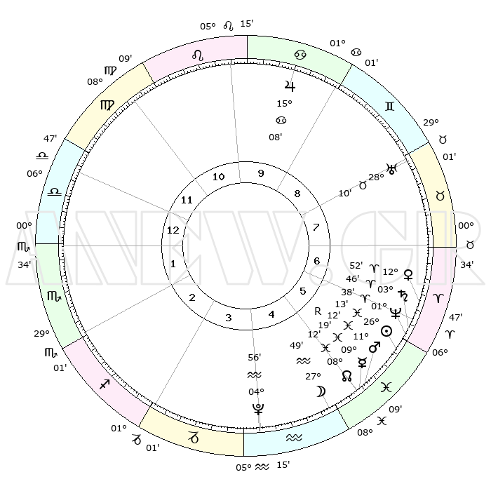 | | ΘΕΣΕΙΣ ΠΛΑΝΗΤΩΝ ΑΣΤΡΟΛΟΓΙΚΟΥ ΧΑΡΤΗ ΤΗΣ ΣΤΙΓΜΗΣ ΑΥΤΗΣ | | | | Πλανήτης | Ζώδιο | Μοίρες | Δεκαήμ. | Σε οίκο | Απόκλιση | | Ακμές των οίκων | | Ηλιος | Ιχθείς | 26°09' | Τρίτο | 6 | 01 S 32 | | 1ος | 13°06' | Ζυγός | | Σελήνη | Υδροχόος | 27°02' | Τρίτο | 5 | 13 S 32 | | 2ος | 10°32' | Σκορπιός | | Ερμής | Ιχθείς | 09°21'R | Πρώτο | 5 | 06 S 13 | | 3ος | 11°30' | Τοξότης | | Αφροδίτη | Κριός | 12°48' | Δεύτερο | 6 | 04 N 08 | | 4ος | 14°47' | Αιγόκερως | | Αρης | Ιχθείς | 11°09' | Δεύτερο | 5 | 08 S 23 | | 5ος | 17°43' | Υδροχόος | | Δίας | Καρκίνος | 15°08' | Δεύτερο | 10 | 22 N 56 | | 6ος | 17°34' | Ιχθείς | | Κρόνος | Κριός | 03°46' | Πρώτο | 6 | 00 S 27 | | 7ος | 13°06' | Κριός | | Ουρανός | Ταύρος | 28°10' | Τρίτο | 8 | 19 N 35 | | 8ος | 10°32' | Ταύρος | | Ποσειδώνας | Κριός | 01°38' | Πρώτο | 6 | 00 S 33 | | 9ος | 11°30' | Δίδυμοι | | Πλούτωνας | Υδροχόος | 04°56' | Πρώτο | 4 | 22 S 49 | | 10ος | 14°47' | Καρκίνος | | Β. Δεσμός | Ιχθείς | 08°13' | Πρώτο | 5 | 08 S 29 | | 11ος | 17°43' | Λέων | | Ωροσκόπος | Ζυγός | 13°06' | Δεύτερο | | | 12ος | 17°34' | Παρθένος | | Μεσουράνημα | Καρκίνος | 14°47' | Δεύτερο | | | |