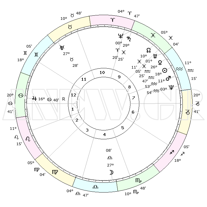 | | ΘΕΣΕΙΣ ΠΛΑΝΗΤΩΝ ΑΣΤΡΟΛΟΓΙΚΟΥ ΧΑΡΤΗ ΤΗΣ ΣΤΙΓΜΗΣ ΑΥΤΗΣ | | | | Πλανήτης | Ζώδιο | Μοίρες | Δεκαήμ. | Σε οίκο | Απόκλιση | | Ακμές των οίκων | | Ηλιος | Υδροχόος | 18°44' | Δεύτερο | 9 | 15 S 12 | | 1ος | 02°21' | Καρκίνος | | Σελήνη | Ζυγός | 26°24' | Τρίτο | 5 | 13 S 47 | | 2ος | 23°01' | Καρκίνος | | Ερμής | Ιχθείς | 00°59' | Πρώτο | 9 | 12 S 18 | | 3ος | 14°58' | Λέων | | Αφροδίτη | Υδροχόος | 26°21' | Τρίτο | 9 | 14 S 05 | | 4ος | 11°40' | Παρθένος | | Αρης | Υδροχόος | 11°50' | Δεύτερο | 8 | 18 S 15 | | 5ος | 15°58' | Ζυγός | | Δίας | Καρκίνος | 16°41'R | Δεύτερο | 1 | 22 N 42 | | 6ος | 25°47' | Σκορπιός | | Κρόνος | Ιχθείς | 29°25' | Τρίτο | 10 | 02 S 13 | | 7ος | 02°21' | Αιγόκερως | | Ουρανός | Ταύρος | 27°28' | Τρίτο | 12 | 19 N 24 | | 8ος | 23°01' | Αιγόκερως | | Ποσειδώνας | Κριός | 00°20' | Πρώτο | 10 | 01 S 04 | | 9ος | 14°58' | Υδροχόος | | Πλούτωνας | Υδροχόος | 03°54' | Πρώτο | 8 | 22 S 59 | | 10ος | 11°40' | Ιχθείς | | Β. Δεσμός | Ιχθείς | 10°11' | Δεύτερο | 9 | 07 S 45 | | 11ος | 15°58' | Κριός | | Ωροσκόπος | Καρκίνος | 02°21' | Πρώτο | | | 12ος | 25°47' | Ταύρος | | Μεσουράνημα | Ιχθείς | 11°40' | Δεύτερο | | | |