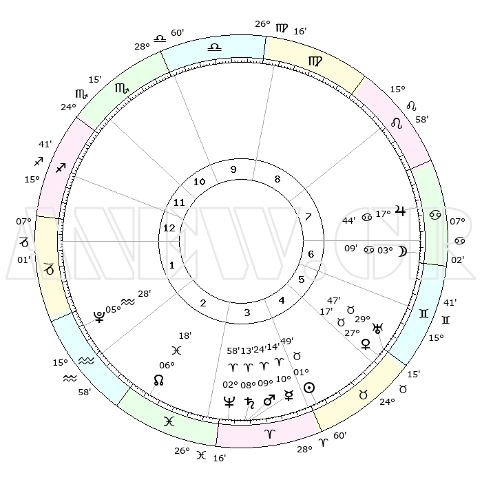 | | ΘΕΣΕΙΣ ΠΛΑΝΗΤΩΝ ΑΣΤΡΟΛΟΓΙΚΟΥ ΧΑΡΤΗ ΤΗΣ ΣΤΙΓΜΗΣ ΑΥΤΗΣ | | | | Πλανήτης | Ζώδιο | Μοίρες | Δεκαήμ. | Σε οίκο | Απόκλιση | | Ακμές των οίκων | | Ηλιος | Ταύρος | 01°45' | Πρώτο | 5 | 12 N 05 | | 1ος | 12°15' | Τοξότης | | Σελήνη | Καρκίνος | 02°02' | Πρώτο | 7 | 28 N 03 | | 2ος | 15°24' | Αιγόκερως | | Ερμής | Κριός | 10°07' | Δεύτερο | 4 | 01 N 38 | | 3ος | 23°10' | Υδροχόος | | Αφροδίτη | Ταύρος | 27°11' | Τρίτο | 6 | 20 N 00 | | 4ος | 29°03' | Ιχθείς | | Αρης | Κριός | 09°21' | Πρώτο | 4 | 02 N 50 | | 5ος | 28°18' | Κριός | | Δίας | Καρκίνος | 17°44' | Δεύτερο | 8 | 22 N 38 | | 6ος | 21°46' | Ταύρος | | Κρόνος | Κριός | 08°12' | Πρώτο | 4 | 01 N 16 | | 7ος | 12°15' | Δίδυμοι | | Ουρανός | Ταύρος | 29°47' | Τρίτο | 6 | 19 N 56 | | 8ος | 15°24' | Καρκίνος | | Ποσειδώνας | Κριός | 02°58' | Πρώτο | 4 | 00 S 02 | | 9ος | 23°10' | Λέων | | Πλούτωνας | Υδροχόος | 05°27' | Πρώτο | 2 | 22 S 48 | | 10ος | 29°03' | Παρθένος | | Β. Δεσμός | Ιχθείς | 06°18' | Πρώτο | 3 | 09 S 12 | | 11ος | 28°18' | Ζυγός | | Ωροσκόπος | Τοξότης | 12°15' | Δεύτερο | | | 12ος | 21°46' | Σκορπιός | | Μεσουράνημα | Παρθένος | 29°03' | Τρίτο | | | |