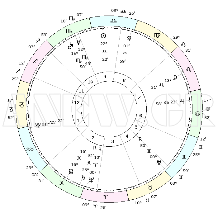 | ΘΕΣΕΙΣ ΠΛΑΝΗΤΩΝ ΑΣΤΡΟΛΟΓΙΚΟΥ ΧΑΡΤΗ ΤΗΣ ΣΤΙΓΜΗΣ ΑΥΤΗΣ | | Πλανήτης | Ζώδιο | Μοίρες | Δεκαήμ. | Σε οίκο | Απόκλιση | | Ακμές των οίκων | Ηλιος | Ζυγός | 22°06' | Τρίτο | 12 | 08 S 36 | | 1ος | 26°12' | Ζυγός | Σελήνη | Λέων | 10°03' | Δεύτερο | 10 | 20 N 49 | | 2ος | 24°24' | Σκορπιός | Ερμής | Σκορπιός | 12°21' | Δεύτερο | 1 | 17 S 13 | | 3ος | 26°04' | Τοξότης | Αφροδίτη | Ζυγός | 01°39' | Πρώτο | 11 | 00 N 44 | | 4ος | 00°01' | Υδροχόος | Αρης | Σκορπιός | 15°39' | Δεύτερο | 1 | 16 S 44 | | 5ος | 02°58' | Ιχθείς | Δίας | Καρκίνος | 23°57' | Τρίτο | 9 | 21 N 22 | | 6ος | 01°57' | Κριός | Κρόνος | Ιχθείς | 26°52'R | Τρίτο | 5 | 03 S 32 | | 7ος | 26°12' | Κριός | Ουρανός | Δίδυμοι | 00°51'R | Πρώτο | 8 | 20 N 07 | | 8ος | 24°24' | Ταύρος | Ποσειδώνας | Κριός | 00°10'R | Πρώτο | 5 | 01 S 12 | | 9ος | 26°04' | Δίδυμοι | Πλούτωνας | Υδροχόος | 01°22' | Πρώτο | 4 | 23 S 32 | | 10ος | 00°01' | Λέων | Β. Δεσμός | Ιχθείς | 16°17' | Δεύτερο | 5 | 05 S 25 | | 11ος | 02°58' | Παρθένος | Ωροσκόπος | Ζυγός | 26°12' | Τρίτο | | | 12ος | 01°57' | Ζυγός | Μεσουράνημα | Λέων | 00°01' | Πρώτο | | | |