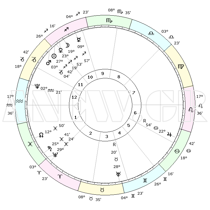 | | ΘΕΣΕΙΣ ΠΛΑΝΗΤΩΝ ΑΣΤΡΟΛΟΓΙΚΟΥ ΧΑΡΤΗ ΤΗΣ ΣΤΙΓΜΗΣ ΑΥΤΗΣ | | | | Πλανήτης | Ζώδιο | Μοίρες | Δεκαήμ. | Σε οίκο | Απόκλιση | | Ακμές των οίκων | | Ηλιος | Τοξότης | 27°38' | Τρίτο | 12 | 23 S 25 | | 1ος | 17°30' | Αιγόκερως | | Σελήνη | Τοξότης | 19°03' | Δεύτερο | 11 | 27 S 56 | | 2ος | 29°03' | Υδροχόος | | Ερμής | Τοξότης | 09°51' | Πρώτο | 11 | 20 S 57 | | 3ος | 08°60' | Κριός | | Αφροδίτη | Τοξότης | 23°14' | Τρίτο | 11 | 23 S 16 | | 4ος | 09°45' | Ταύρος | | Αρης | Αιγόκερως | 03°01' | Πρώτο | 12 | 24 S 12 | | 5ος | 03°40' | Δίδυμοι | | Δίας | Καρκίνος | 22°54'R | Τρίτο | 7 | 21 N 42 | | 6ος | 24°53' | Δίδυμοι | | Κρόνος | Ιχθείς | 25°41' | Τρίτο | 2 | 03 S 50 | | 7ος | 17°30' | Καρκίνος | | Ουρανός | Ταύρος | 28°21'R | Τρίτο | 4 | 19 N 35 | | 8ος | 29°03' | Λέων | | Ποσειδώνας | Ιχθείς | 29°24' | Τρίτο | 2 | 01 S 28 | | 9ος | 08°60' | Ζυγός | | Πλούτωνας | Υδροχόος | 02°21' | Πρώτο | 1 | 23 S 18 | | 10ος | 09°45' | Σκορπιός | | Β. Δεσμός | Ιχθείς | 12°51' | Δεύτερο | 2 | 06 S 44 | | 11ος | 03°40' | Τοξότης | | Ωροσκόπος | Αιγόκερως | 17°30' | Δεύτερο | | | 12ος | 24°53' | Τοξότης | | Μεσουράνημα | Σκορπιός | 09°45' | Πρώτο | | | |
