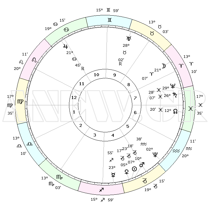 | | ΘΕΣΕΙΣ ΠΛΑΝΗΤΩΝ ΑΣΤΡΟΛΟΓΙΚΟΥ ΧΑΡΤΗ ΤΗΣ ΣΤΙΓΜΗΣ ΑΥΤΗΣ | | | | Πλανήτης | Ζώδιο | Μοίρες | Δεκαήμ. | Σε οίκο | Απόκλιση | | Ακμές των οίκων | | Ηλιος | Αιγόκερως | 07°19' | Πρώτο | 5 | 23 S 14 | | 1ος | 26°52' | Λέων | | Σελήνη | Κριός | 20°07' | Τρίτο | 9 | 10 N 49 | | 2ος | 20°24' | Παρθένος | | Ερμής | Τοξότης | 23°49' | Τρίτο | 4 | 23 S 30 | | 3ος | 18°46' | Ζυγός | | Αφροδίτη | Αιγόκερως | 05°11' | Πρώτο | 5 | 23 S 43 | | 4ος | 21°38' | Σκορπιός | | Αρης | Αιγόκερως | 10°15' | Δεύτερο | 5 | 23 S 54 | | 5ος | 26°03' | Τοξότης | | Δίας | Καρκίνος | 21°46'R | Τρίτο | 11 | 21 N 54 | | 6ος | 28°16' | Αιγόκερως | | Κρόνος | Ιχθείς | 26°06' | Τρίτο | 8 | 03 S 38 | | 7ος | 26°52' | Υδροχόος | | Ουρανός | Ταύρος | 28°02'R | Τρίτο | 10 | 19 N 31 | | 8ος | 20°24' | Ιχθείς | | Ποσειδώνας | Ιχθείς | 29°28' | Τρίτο | 8 | 01 S 26 | | 9ος | 18°46' | Κριός | | Πλούτωνας | Υδροχόος | 02°38' | Πρώτο | 6 | 23 S 14 | | 10ος | 21°38' | Ταύρος | | Β. Δεσμός | Ιχθείς | 12°20' | Δεύτερο | 7 | 06 S 56 | | 11ος | 26°03' | Δίδυμοι | | Ωροσκόπος | Λέων | 26°52' | Τρίτο | | | 12ος | 28°16' | Καρκίνος | | Μεσουράνημα | Ταύρος | 21°38' | Τρίτο | | | |
