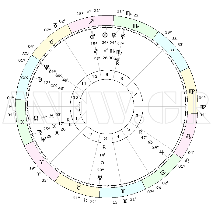 | | ΘΕΣΕΙΣ ΠΛΑΝΗΤΩΝ ΑΣΤΡΟΛΟΓΙΚΟΥ ΧΑΡΤΗ ΤΗΣ ΣΤΙΓΜΗΣ ΑΥΤΗΣ | | | | Πλανήτης | Ζώδιο | Μοίρες | Δεκαήμ. | Σε οίκο | Απόκλιση | | Ακμές των οίκων | | Ηλιος | Τοξότης | 04°26' | Πρώτο | 9 | 21 S 01 | | 1ος | 00°01' | Ιχθείς | | Σελήνη | Υδροχόος | 12°42' | Δεύτερο | 12 | 19 S 32 | | 2ος | 15°26' | Κριός | | Ερμής | Σκορπιός | 21°43'R | Τρίτο | 9 | 16 S 06 | | 3ος | 18°09' | Ταύρος | | Αφροδίτη | Σκορπιός | 24°29' | Τρίτο | 9 | 18 S 03 | | 4ος | 12°33' | Δίδυμοι | | Αρης | Τοξότης | 15°56' | Δεύτερο | 10 | 23 S 19 | | 5ος | 04°14' | Καρκίνος | | Δίας | Καρκίνος | 24°47'R | Τρίτο | 5 | 21 N 19 | | 6ος | 27°47' | Καρκίνος | | Κρόνος | Ιχθείς | 25°17'R | Τρίτο | 1 | 04 S 04 | | 7ος | 00°01' | Παρθένος | | Ουρανός | Ταύρος | 29°14'R | Τρίτο | 3 | 19 N 47 | | 8ος | 15°26' | Ζυγός | | Ποσειδώνας | Ιχθείς | 29°26'R | Τρίτο | 1 | 01 S 28 | | 9ος | 18°09' | Σκορπιός | | Πλούτωνας | Υδροχόος | 01°49' | Πρώτο | 12 | 23 S 25 | | 10ος | 12°33' | Τοξότης | | Β. Δεσμός | Ιχθείς | 14°03' | Δεύτερο | 1 | 06 S 16 | | 11ος | 04°14' | Αιγόκερως | | Ωροσκόπος | Ιχθείς | 00°01' | Πρώτο | | | 12ος | 27°47' | Αιγόκερως | | Μεσουράνημα | Τοξότης | 12°33' | Δεύτερο | | | |