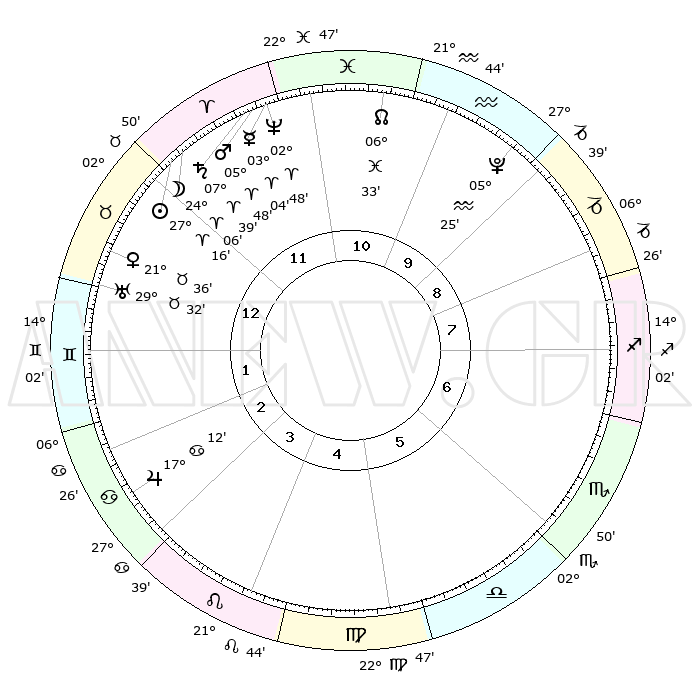 | | ΘΕΣΕΙΣ ΠΛΑΝΗΤΩΝ ΑΣΤΡΟΛΟΓΙΚΟΥ ΧΑΡΤΗ ΤΗΣ ΣΤΙΓΜΗΣ ΑΥΤΗΣ | | | | Πλανήτης | Ζώδιο | Μοίρες | Δεκαήμ. | Σε οίκο | Απόκλιση | | Ακμές των οίκων | | Ηλιος | Κριός | 27°13' | Τρίτο | 12 | 10 N 29 | | 1ος | 20°39' | Ταύρος | | Σελήνη | Κριός | 23°17' | Τρίτο | 12 | 12 N 26 | | 2ος | 17°30' | Δίδυμοι | | Ερμής | Κριός | 02°59' | Πρώτο | 11 | 01 S 14 | | 3ος | 09°22' | Καρκίνος | | Αφροδίτη | Ταύρος | 21°31' | Τρίτο | 1 | 18 N 24 | | 4ος | 01°34' | Λέων | | Αρης | Κριός | 05°45' | Πρώτο | 12 | 01 N 24 | | 5ος | 28°31' | Λέων | | Δίας | Καρκίνος | 17°12' | Δεύτερο | 3 | 22 N 42 | | 6ος | 05°20' | Ζυγός | | Κρόνος | Κριός | 07°39' | Πρώτο | 12 | 01 N 04 | | 7ος | 20°39' | Σκορπιός | | Ουρανός | Ταύρος | 29°32' | Τρίτο | 1 | 19 N 53 | | 8ος | 17°30' | Τοξότης | | Ποσειδώνας | Κριός | 02°48' | Πρώτο | 11 | 00 S 05 | | 9ος | 09°22' | Αιγόκερως | | Πλούτωνας | Υδροχόος | 05°25' | Πρώτο | 10 | 22 S 47 | | 10ος | 01°34' | Υδροχόος | | Β. Δεσμός | Ιχθείς | 06°33' | Πρώτο | 11 | 09 S 06 | | 11ος | 28°31' | Υδροχόος | | Ωροσκόπος | Ταύρος | 20°39' | Τρίτο | | | 12ος | 05°20' | Κριός | | Μεσουράνημα | Υδροχόος | 01°34' | Πρώτο | | | |