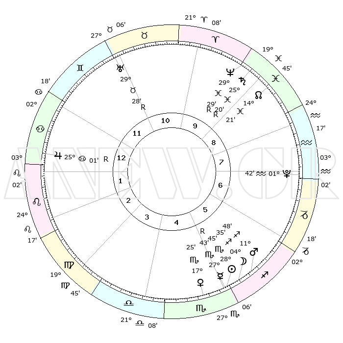 | | ΘΕΣΕΙΣ ΠΛΑΝΗΤΩΝ ΑΣΤΡΟΛΟΓΙΚΟΥ ΧΑΡΤΗ ΤΗΣ ΣΤΙΓΜΗΣ ΑΥΤΗΣ | | | | Πλανήτης | Ζώδιο | Μοίρες | Δεκαήμ. | Σε οίκο | Απόκλιση | | Ακμές των οίκων | | Ηλιος | Σκορπιός | 28°41' | Τρίτο | 5 | 19 S 52 | | 1ος | 12°58' | Καρκίνος | | Σελήνη | Τοξότης | 03°47' | Πρώτο | 5 | 25 S 43 | | 2ος | 03°24' | Λέων | | Ερμής | Σκορπιός | 27°49'R | Τρίτο | 5 | 19 S 01 | | 3ος | 26°19' | Λέων | | Αφροδίτη | Σκορπιός | 17°20' | Δεύτερο | 5 | 16 S 00 | | 4ος | 24°47' | Παρθένος | | Αρης | Τοξότης | 11°45' | Δεύτερο | 6 | 22 S 46 | | 5ος | 00°21' | Σκορπιός | | Δίας | Καρκίνος | 25°01'R | Τρίτο | 1 | 21 N 15 | | 6ος | 08°52' | Τοξότης | | Κρόνος | Ιχθείς | 25°20'R | Τρίτο | 10 | 04 S 04 | | 7ος | 12°58' | Αιγόκερως | | Ουρανός | Ταύρος | 29°28'R | Τρίτο | 11 | 19 N 50 | | 8ος | 03°24' | Υδροχόος | | Ποσειδώνας | Ιχθείς | 29°29'R | Τρίτο | 10 | 01 S 27 | | 9ος | 26°19' | Υδροχόος | | Πλούτωνας | Υδροχόος | 01°42' | Πρώτο | 7 | 23 S 27 | | 10ος | 24°47' | Ιχθείς | | Β. Δεσμός | Ιχθείς | 14°21' | Δεύτερο | 9 | 06 S 09 | | 11ος | 00°21' | Ταύρος | | Ωροσκόπος | Καρκίνος | 12°58' | Δεύτερο | | | 12ος | 08°52' | Δίδυμοι | | Μεσουράνημα | Ιχθείς | 24°47' | Τρίτο | | | |