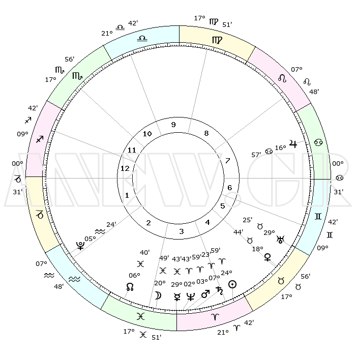| | ΘΕΣΕΙΣ ΠΛΑΝΗΤΩΝ ΑΣΤΡΟΛΟΓΙΚΟΥ ΧΑΡΤΗ ΤΗΣ ΣΤΙΓΜΗΣ ΑΥΤΗΣ | | | | Πλανήτης | Ζώδιο | Μοίρες | Δεκαήμ. | Σε οίκο | Απόκλιση | | Ακμές των οίκων | | Ηλιος | Κριός | 24°54' | Τρίτο | 5 | 09 N 38 | | 1ος | 06°32' | Τοξότης | | Σελήνη | Ιχθείς | 19°45' | Δεύτερο | 3 | 03 S 06 | | 2ος | 08°39' | Αιγόκερως | | Ερμής | Ιχθείς | 29°36' | Τρίτο | 4 | 02 S 32 | | 3ος | 15°28' | Υδροχόος | | Αφροδίτη | Ταύρος | 18°39' | Δεύτερο | 6 | 17 N 32 | | 4ος | 21°32' | Ιχθείς | | Αρης | Κριός | 03°55' | Πρώτο | 4 | 00 N 39 | | 5ος | 21°41' | Κριός | | Δίας | Καρκίνος | 16°57' | Δεύτερο | 8 | 22 N 44 | | 6ος | 15°52' | Ταύρος | | Κρόνος | Κριός | 07°22' | Πρώτο | 4 | 00 N 57 | | 7ος | 06°32' | Δίδυμοι | | Ουρανός | Ταύρος | 29°25' | Τρίτο | 6 | 19 N 51 | | 8ος | 08°39' | Καρκίνος | | Ποσειδώνας | Κριός | 02°43' | Πρώτο | 4 | 00 S 07 | | 9ος | 15°28' | Λέων | | Πλούτωνας | Υδροχόος | 05°24' | Πρώτο | 2 | 22 S 47 | | 10ος | 21°32' | Παρθένος | | Β. Δεσμός | Ιχθείς | 06°40' | Πρώτο | 3 | 09 S 04 | | 11ος | 21°41' | Ζυγός | | Ωροσκόπος | Τοξότης | 06°32' | Πρώτο | | | 12ος | 15°52' | Σκορπιός | | Μεσουράνημα | Παρθένος | 21°32' | Τρίτο | | | |