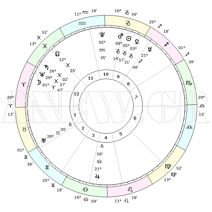 | | ΘΕΣΕΙΣ ΠΛΑΝΗΤΩΝ ΑΣΤΡΟΛΟΓΙΚΟΥ ΧΑΡΤΗ ΤΗΣ ΣΤΙΓΜΗΣ ΑΥΤΗΣ | | | | Πλανήτης | Ζώδιο | Μοίρες | Δεκαήμ. | Σε οίκο | Απόκλιση | | Ακμές των οίκων | | Ηλιος | Αιγόκερως | 05°52' | Πρώτο | 10 | 23 S 18 | | 1ος | 15°07' | Ιχθείς | | Σελήνη | Κριός | 00°46' | Πρώτο | 1 | 01 N 52 | | 2ος | 28°34' | Κριός | | Ερμής | Τοξότης | 21°42' | Τρίτο | 10 | 23 S 13 | | 3ος | 28°26' | Ταύρος | | Αφροδίτη | Αιγόκερως | 03°25' | Πρώτο | 10 | 23 S 43 | | 4ος | 21°35' | Δίδυμοι | | Αρης | Αιγόκερως | 09°10' | Πρώτο | 10 | 23 S 59 | | 5ος | 13°24' | Καρκίνος | | Δίας | Καρκίνος | 21°57'R | Τρίτο | 5 | 21 N 52 | | 6ος | 08°42' | Λέων | | Κρόνος | Ιχθείς | 26°02' | Τρίτο | 1 | 03 S 40 | | 7ος | 15°07' | Παρθένος | | Ουρανός | Ταύρος | 28°05'R | Τρίτο | 2 | 19 N 32 | | 8ος | 28°34' | Ζυγός | | Ποσειδώνας | Ιχθείς | 29°27' | Τρίτο | 1 | 01 S 26 | | 9ος | 28°26' | Σκορπιός | | Πλούτωνας | Υδροχόος | 02°35' | Πρώτο | 11 | 23 S 15 | | 10ος | 21°34' | Τοξότης | | Β. Δεσμός | Ιχθείς | 12°25' | Δεύτερο | 12 | 06 S 54 | | 11ος | 13°24' | Αιγόκερως | | Ωροσκόπος | Ιχθείς | 15°07' | Δεύτερο | | | 12ος | 08°42' | Υδροχόος | | Μεσουράνημα | Τοξότης | 21°34' | Τρίτο | | | |