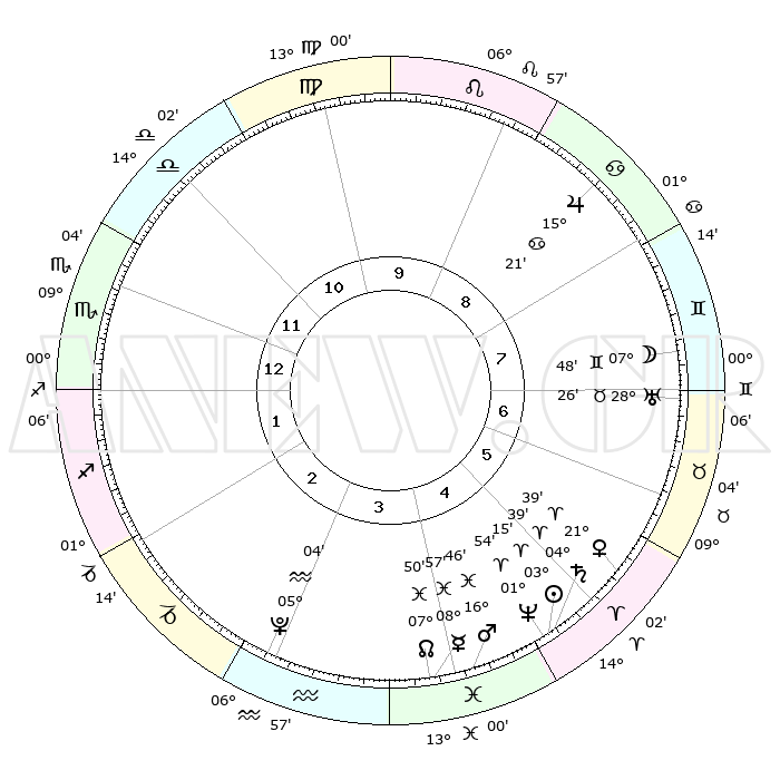 | | ΘΕΣΕΙΣ ΠΛΑΝΗΤΩΝ ΑΣΤΡΟΛΟΓΙΚΟΥ ΧΑΡΤΗ ΤΗΣ ΣΤΙΓΜΗΣ ΑΥΤΗΣ | | | | Πλανήτης | Ζώδιο | Μοίρες | Δεκαήμ. | Σε οίκο | Απόκλιση | | Ακμές των οίκων | | Ηλιος | Κριός | 03°11' | Πρώτο | 5 | 01 N 16 | | 1ος | 11°09' | Σκορπιός | | Σελήνη | Δίδυμοι | 06°51' | Πρώτο | 7 | 26 N 36 | | 2ος | 10°19' | Τοξότης | | Ερμής | Ιχθείς | 08°55' | Πρώτο | 4 | 07 S 58 | | 3ος | 13°20' | Αιγόκερως | | Αφροδίτη | Κριός | 21°34' | Τρίτο | 6 | 07 N 42 | | 4ος | 18°20' | Υδροχόος | | Αρης | Ιχθείς | 16°43' | Δεύτερο | 4 | 06 S 14 | | 5ος | 20°57' | Ιχθείς | | Δίας | Καρκίνος | 15°21' | Δεύτερο | 9 | 22 N 55 | | 6ος | 18°28' | Κριός | | Κρόνος | Κριός | 04°39' | Πρώτο | 5 | 00 S 06 | | 7ος | 11°09' | Ταύρος | | Ουρανός | Ταύρος | 28°26' | Τρίτο | 7 | 19 N 38 | | 8ος | 10°19' | Δίδυμοι | | Ποσειδώνας | Κριός | 01°54' | Πρώτο | 5 | 00 S 27 | | 9ος | 13°20' | Καρκίνος | | Πλούτωνας | Υδροχόος | 05°04' | Πρώτο | 3 | 22 S 48 | | 10ος | 18°20' | Λέων | | Β. Δεσμός | Ιχθείς | 07°50' | Πρώτο | 4 | 08 S 38 | | 11ος | 20°57' | Παρθένος | | Ωροσκόπος | Σκορπιός | 11°09' | Δεύτερο | | | 12ος | 18°28' | Ζυγός | | Μεσουράνημα | Λέων | 18°20' | Δεύτερο | | | |